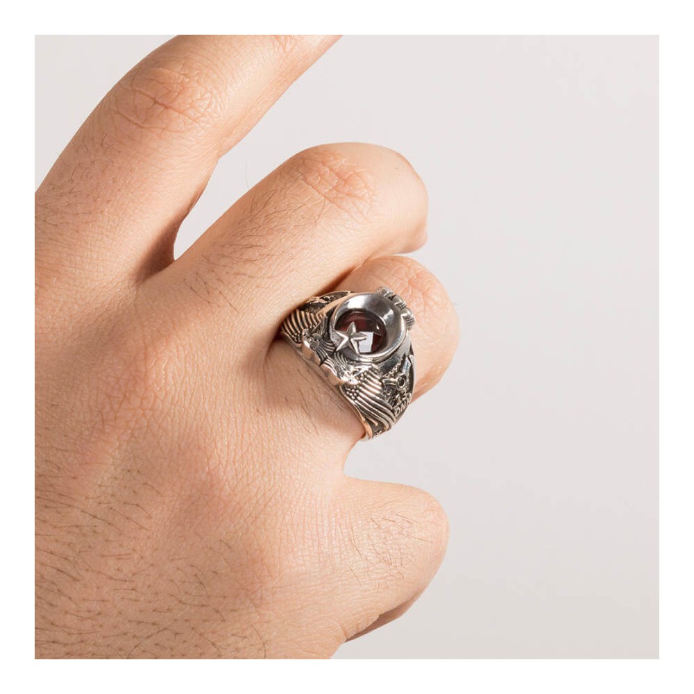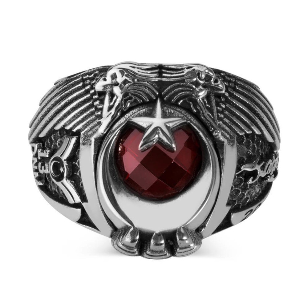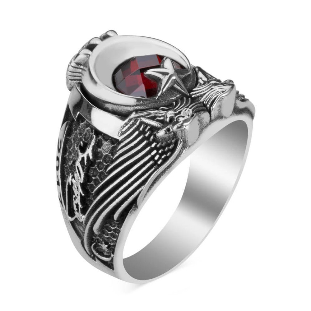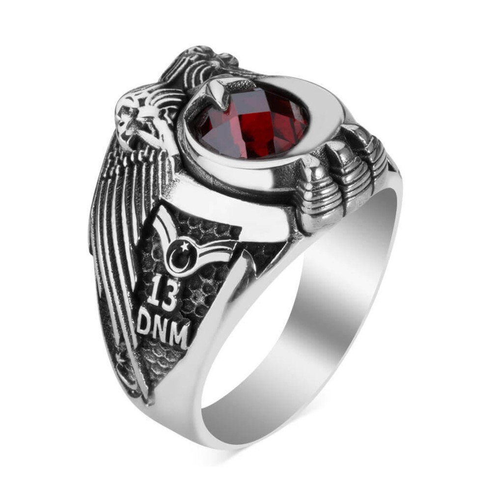 Astsubaylar için tasarlanan 925 ayar gümüş taşlı tasarım Anı yüzüğü'ne daha yakından bakın!Kanatları açık çift kartal başının ay yıldız ile buluşturulduğu bu askeri yüzük, işçiliğinde kullanılan ısıya dayanıklı kırmızı zirkon taş ile zenginleştirilmiştir. Yüzük yanlarında K. Atatürk imzasının yanı sıra Astsubay flaması ve 13.Dönem yazısına yer verilmiştir.Dilediğiniz şekilde dönem yazısını değiştirerek ve yüzük halkası içine yazı yazdırarak size özel hale getirebileceğiniz bu aksesuar Astsubay mensupları için titizlikle hazırlanmıştır.Siz de hemen sipariş verin, en güzel yıllarınızın yaşadığı askerlik günlerini şık bir nişane ile ölümsüzleştirin.Ürün Özellikleri925 ayar gümüşten üretilmiştir.Yaklaşık 14 gram ağırlığındadır. Yüzük işçiliğinde zirkon taş kullanılmıştır.Yüzük yanlarında Astsubay arması ve K. Atatürk imzasına yer verilmiştir.Ömür boyu bakım garantimiz altındadır. Bu gümüş yüzükte neden zirkon taş kullanılıyor?Zirkon taşın en önemli özelliği dayanıklı olmasıdır. Yüksek ısıda ürettiğimiz 925 ayar gümüş yüzüklerimizde yüksek ısıya dayanıklı olduğu için zirkon taş kullanılmaktadır.