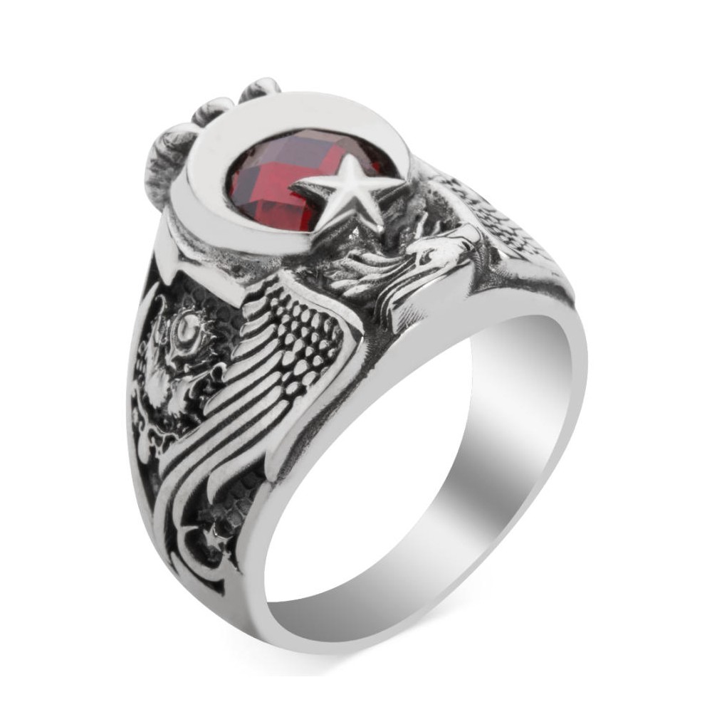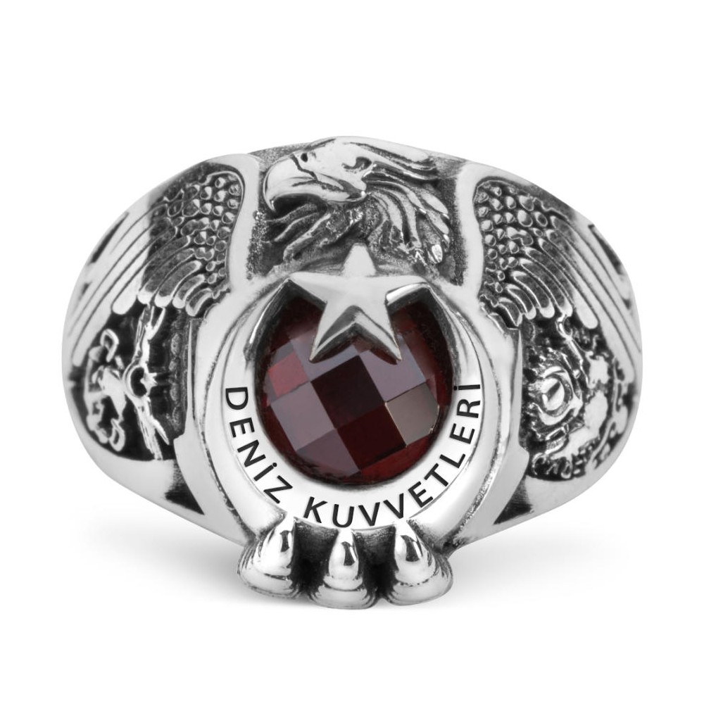 Mesleğinize olan sadakat ve bağlılığınızı taşıdığınız aksesuarlarla da gösterin! Deniz Kuvvetleri mensupları için özel olarak tasarlanan geleneksel kartal başlı tasarımlı bu aksesuara daha yakından incelemeye ne dersiniz? Hakimiyeti ve gücü temsil eden kartal motifi ay yıldız tasarımla birleştirilerek zirkon taş ile zenginleştirilmiştir. Yüzük yanlarında Türk Silahlı Kuvvetleri ve Osmanlı Armasına yer verilmiştir. Hemen sipariş vererek ömür boyu garanti imkanıyla bu özel tasarım askeri yüzüğün sahibi olabilirsiniz.
