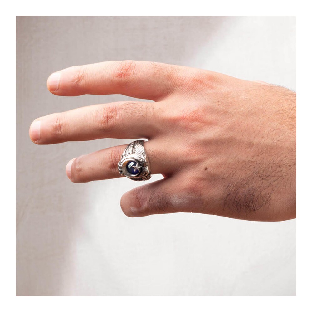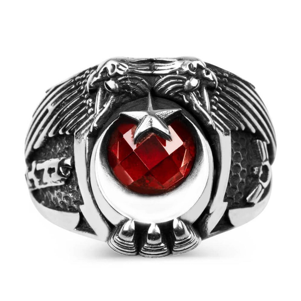 Kahraman uzman çavuşlarımız için tasarlanan bu Anı yüzüğüne daha yakından bakın! Çift kartal başı figürünün ay yıldız ile birleştiği bu aksesuar ısıya dayanıklı zirkon taş ile zenginleştirilmiştir. Yüzük yanlarında Uzman çavuş armasına ve Göktürkçe Türk yazısına yer verilmiştir. Siz de mesleğinizden bir nişaneyi parmağınızda taşımak istiyorsanız bu tarihi motiflerle süslenmiş kartal başlı yüzüğümüzü tercih edebilirsiniz. İsteğe göre yüzüğe kişiselleştirerek size özel hale getirebilirsiniz.