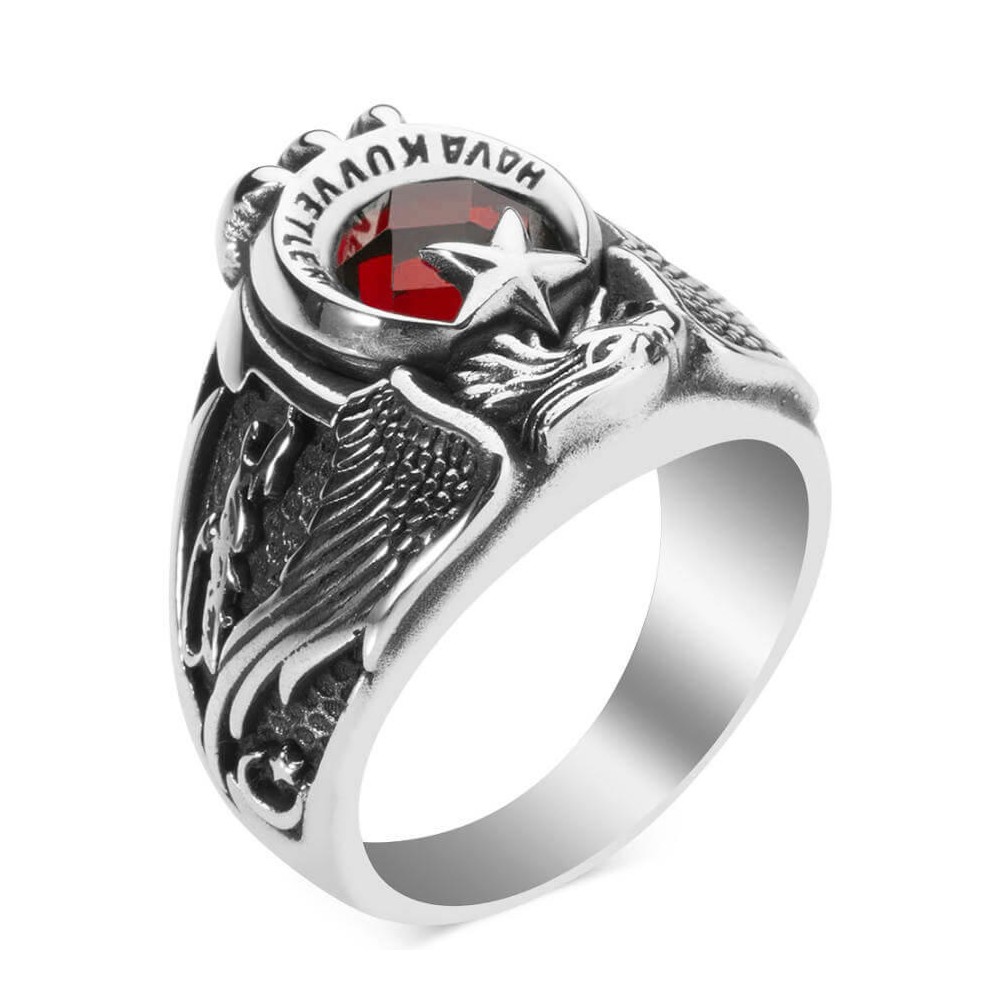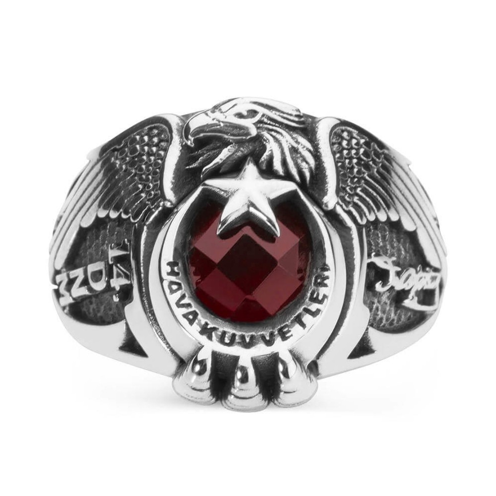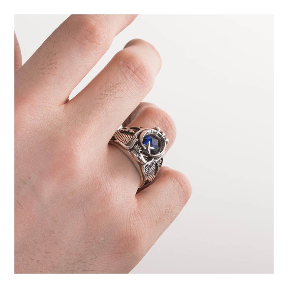 Türk Hava Kuvvetleri mensupları için tasarlanan bu hakimiyet sembollü tek kartal başlı yüzük ile mesleğinizin nişanesini parmağınızda taşıyın! Havacıların mesleki gururlarını her daim yaşamaları için tasarlanan bu Anı yüzüğü 925 ayar gümüşten üretilmiş olup tasarımında şanlı bayrağımızın sembolü ay yıldız ile kartal figürüne yer verilmiştir. İşçiliğinde ısıya dayanıklı zirkon taş ile zenginleştirilmiştir. Hilal içinde "Türk Hava Kuvvetleri" yazılı bu yüzüğün yanlarında K.Atatürk imzası ve dönem yılına yer verilmiştir. Yaklaşık 14 gram ağırlığında olan bu yüzük ile siz de tarzınızı yansıtın! Hemen sipariş verin, ömür boyu garanti ve ücretsiz kargo fırsatı ile sahip olun.