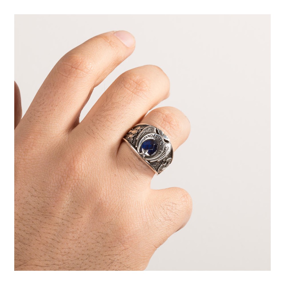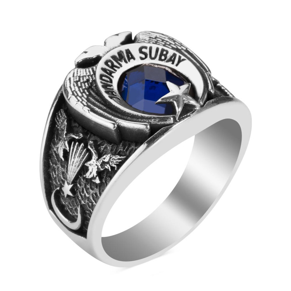 Jandarma Subaylar için tasarlanan 925 ayar gümüş taşlı tasarım Anı yüzüğü'ne daha yakından bakın!Kanatları açık çift kartal başının ay yıldız ile buluşturulduğu bu askeri yüzük, işçiliğinde kullanılan ısıya dayanıklı mavi zirkon taş ile zenginleştirilmiştir. Yüzük yanlarında Jandarma şuasına ve çatılmış tüfekli jandarma armasına yer verilmiştir.Dilediğiniz şekilde yüzük halkası içine yazı yazdırarak size özel hale getirebileceğiniz bu aksesuar Jandarma Subay mensupları için titizlikle hazırlanmıştır.Siz de hemen sipariş verin, en güzel yıllarınızın yaşadığı askerlik günlerini şık bir nişane ile ölümsüzleştirin.Ürün Özellikleri925 ayar gümüşten üretilmiştir.Yaklaşık 14 gram ağırlığındadır. Yüzük işçiliğinde zirkon taş kullanılmıştır.Yüzük yanlarında Jandarma şuası ve Jandarma armasına yer verilmiştir.Ömür boyu bakım garantimiz altındadır. Bu gümüş yüzükte neden zirkon taş kullanılıyor?Zirkon taşın en önemli özelliği dayanıklı olmasıdır. Yüksek ısıda ürettiğimiz 925 ayar gümüş yüzüklerimizde yüksek ısıya dayanıklı olduğu için zirkon taş kullanılmaktadır.