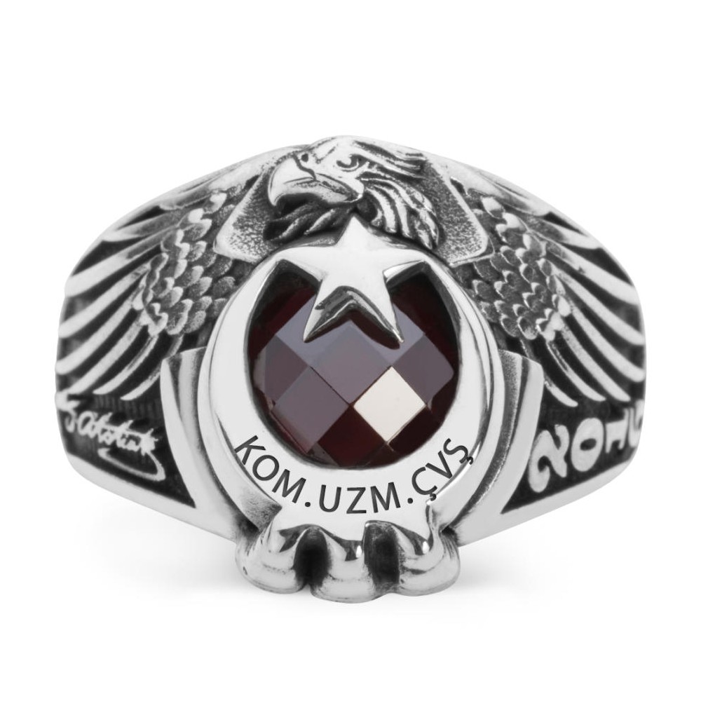 Komando Uzman Çavuşlar için özel olarak tasarlanan kartal başlı pençeli tasarım bu şık devre yüzüğüne daha yakından bakın! 925 ayar gümüşten üretilen bu aksesuar zirkon taş ile zenginleştirilmiş olup yüzük yanlarına M.Kemal Atatürk imzası ile devre yılına yer verilmiştir. Siz de kendi devrenize özel tasarlanan şık bir Anı yüzüğünün sahibi olmak istiyorsanız hemen sipariş verin, ücretsiz kargo imkanından yararlanın. Dilerseniz yüzük halkası, hilal içi ve yüzük yanlarına yazı yazdırarak ürünü size özel hale getirebilirsiniz.