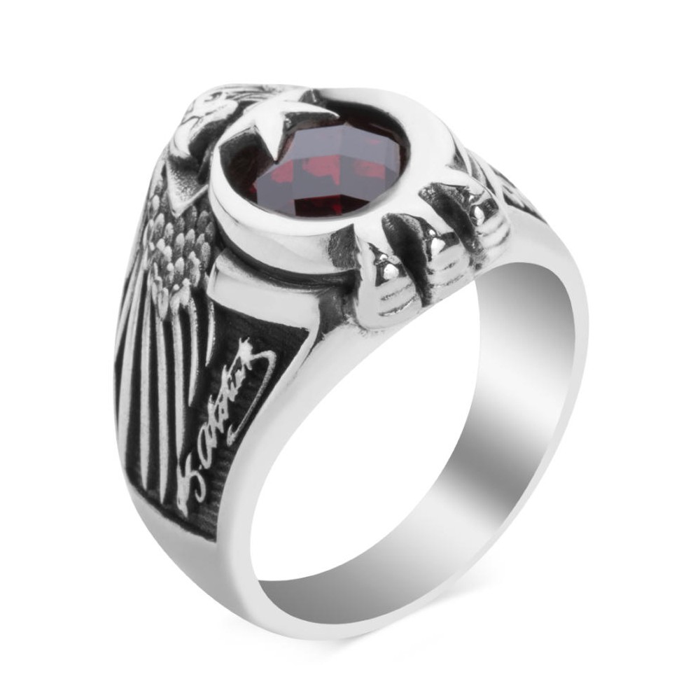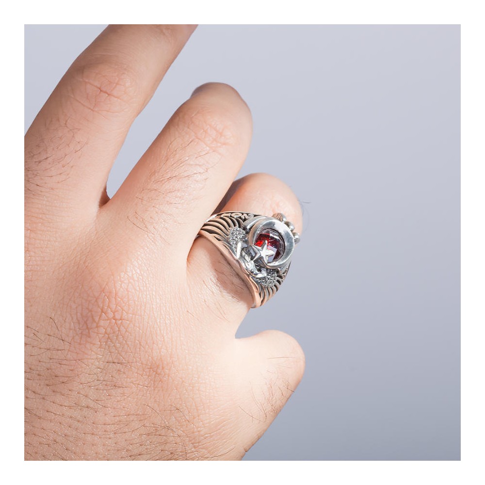 Yüzük üzerindeki kırmızı zirkon taşa ay ve yıldız motifleri işlenerek Türk Bayrağı motifi yapılmıştır, bu motif kartal pençesi ve kartal başı ile birleştirilmiştir.