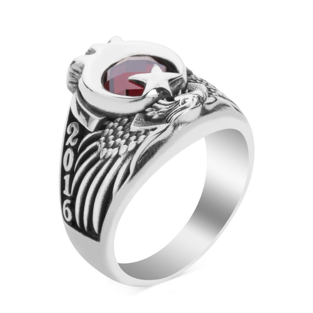 Yüzük üzerindeki kırmızı zirkon taşa ay ve yıldız motifleri işlenerek Türk Bayrağı motifi yapılmıştır, bu motif kartal pençesi ve kartal başı ile birleştirilmiştir.