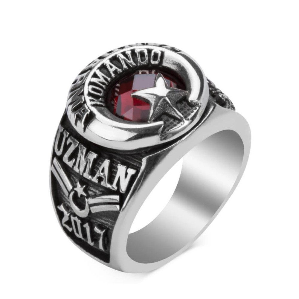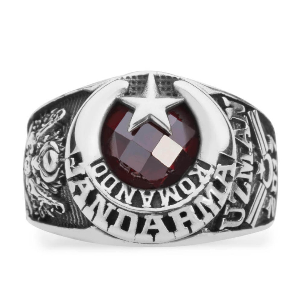 Mesleğinizin gururunu daima yaşayın diye, Uzman Jandarma Komando ekipleri için tasarladığımız bu Anı yüzüğünü incelemeye ne dersiniz? Özel tasarım olarak üretilen bu aksesuarda yüzük hilali üzerine özel kabartma tekniği ile jandarma komando yazısı işlenmiştir. 925 ayar gümüşten üretilen bu yüzük işçiliğinde ısıya dayanıklı kırmızı zirkon taş kullanılmış yüzük yanlarına "Uzman", "2017" işlemesi, diğer bir yanında "Osmanlı Arması" işlemesi yapılmıştır. Siz de bu tarihi motiflerle desteklenen aksesuarın sahibi olmak istiyorsanız hemen Kuyumcumdan'a gelin, tarzınızı yansıtacak şık bir aksesuarın sahibi olun.