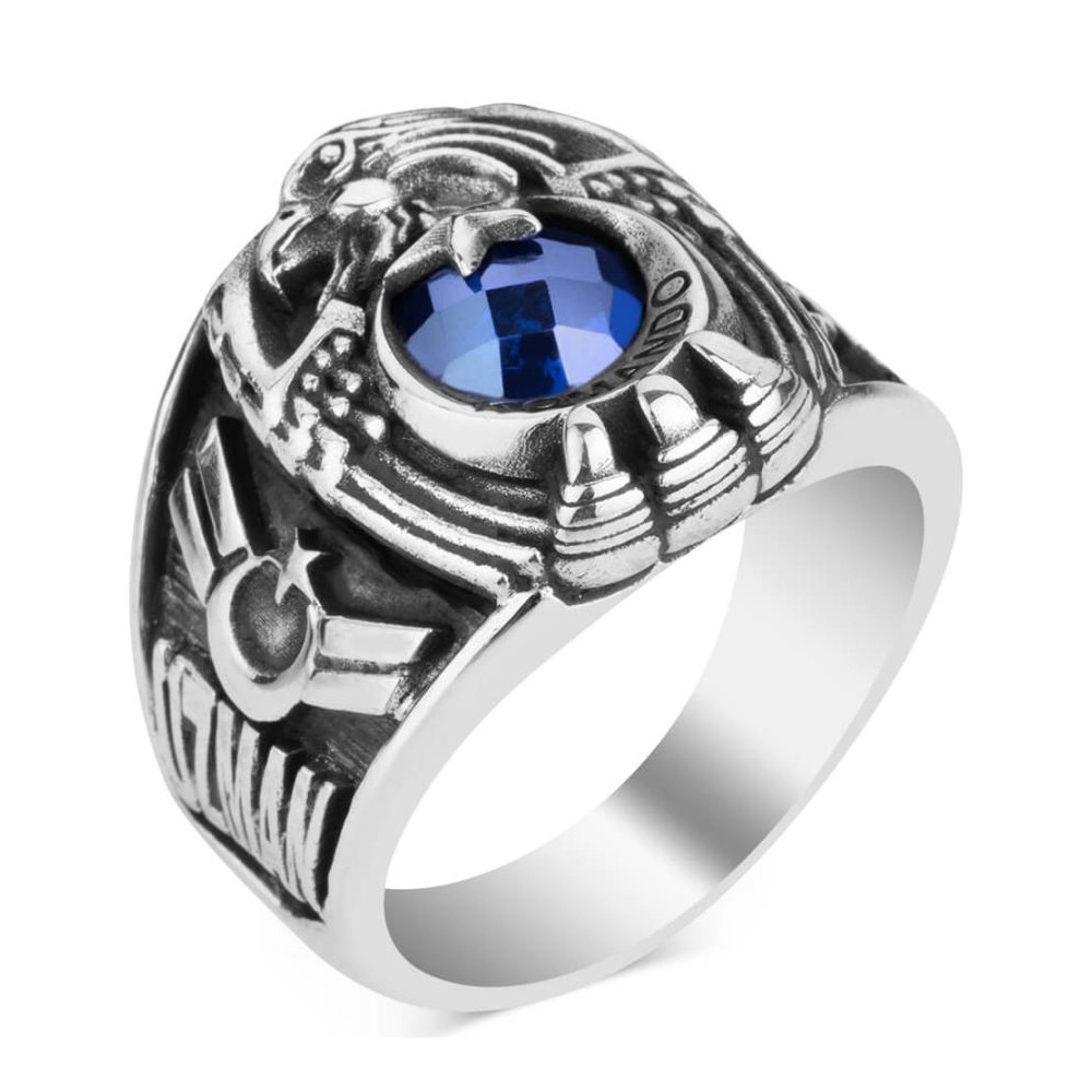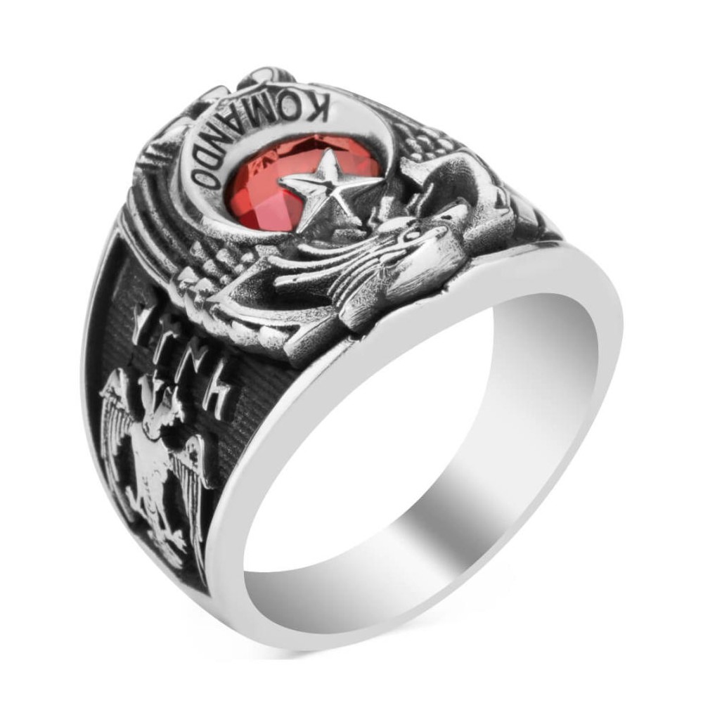 Mesleğinize olan sadakat ve bağlılığınızı taşıdığınız aksesuarlarla da gösterin! Komando Uzman Çavuşlar için özel olarak tasarlanan geleneksel kartal başlı tasarımlı bu aksesuara daha yakından incelemeye ne dersiniz? Hakimiyeti ve gücü temsil eden kartal motifi ay yıldız tasarımla birleştirilerek zirkon taş ile zenginleştirilmiştir. Yüzük yanında Uzman Çavuş rütbesine ve diğer yanında Selçuklu Kartalı ile Göktürkçe Türk yazısına yer verilmiştir. Yüzük hilali içine ise "Komando" yazısı işlenmiştir. Siz de hemen sipariş verin, mükemmel işçilik kusursuz tasarım ilkesiyle üretilen bu şık askeri yüzüğün sahibi olun.