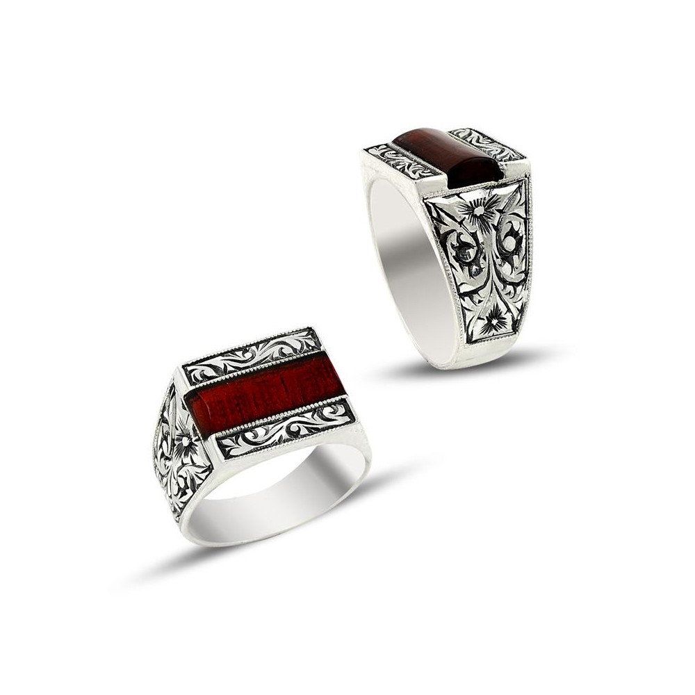Yüzük üzerindeki bordo taş yanları motiflerle işlenmiştir.