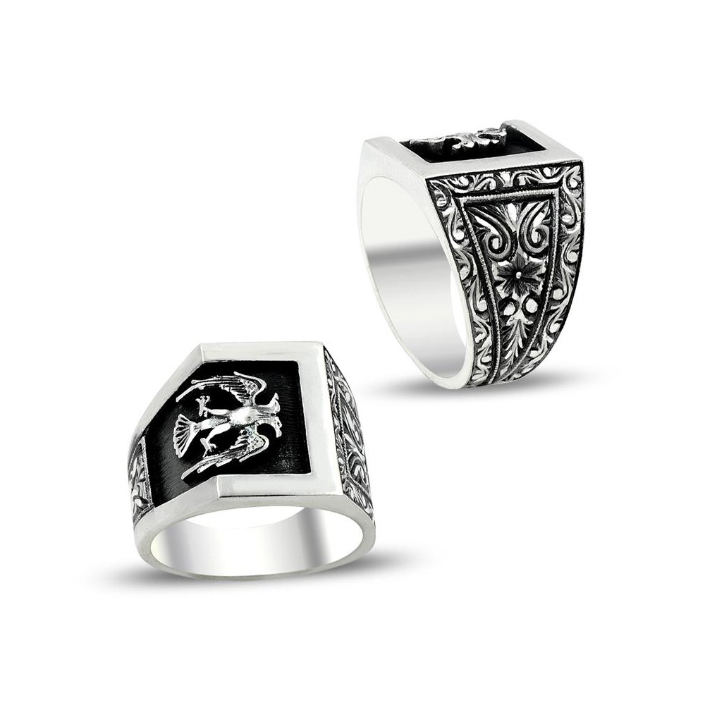 Erzurum El İşçiliği kalem işçilik ile üretilmiş, kırılan kesim üzerine Selçuklu Devleti simgesi olan Çift Başlı Kartal motifi işlenmiş 925 ayar gümüş el işi yüzük.