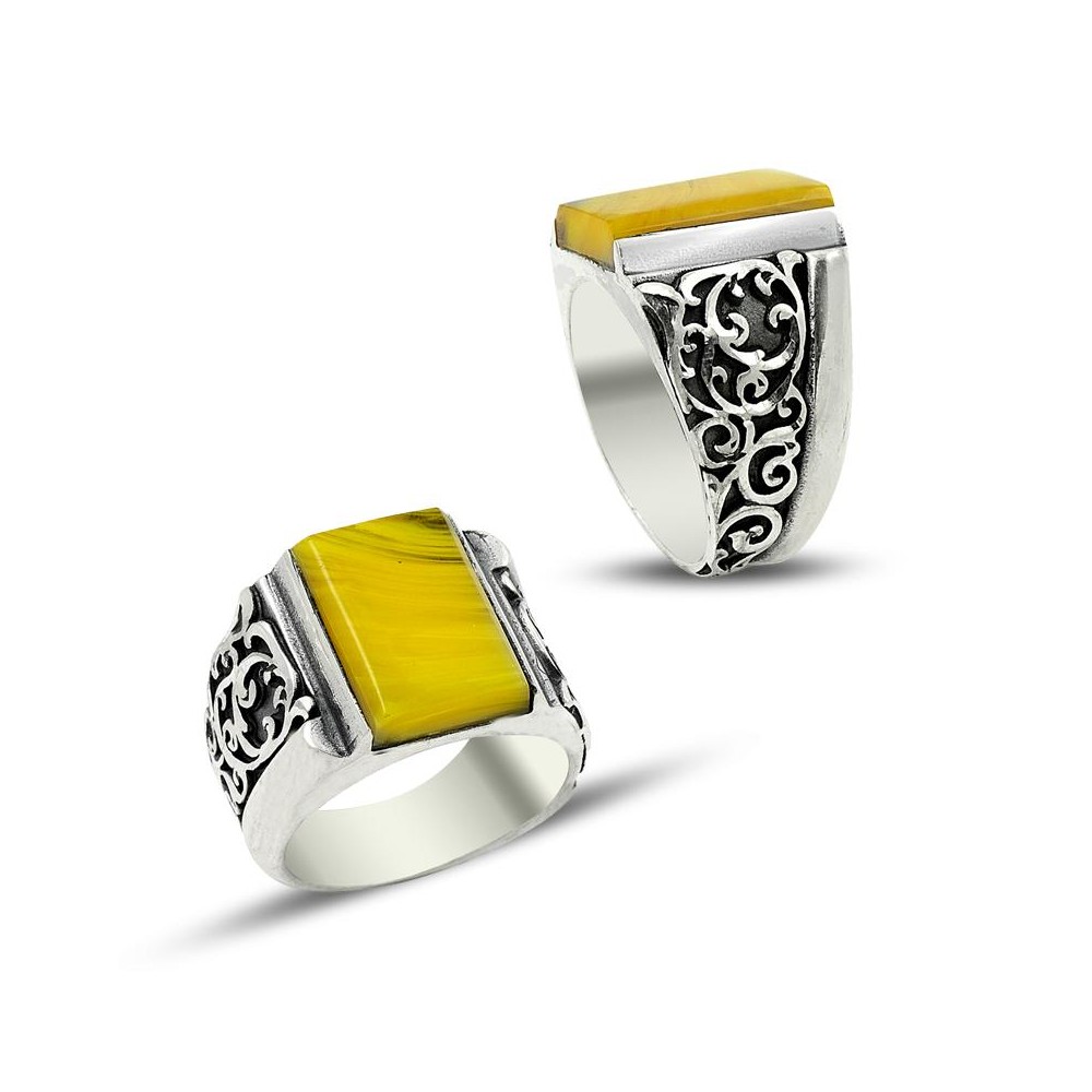 El İşçiliği Sıkma Kehribar Taşlı Gümüş Yüzük