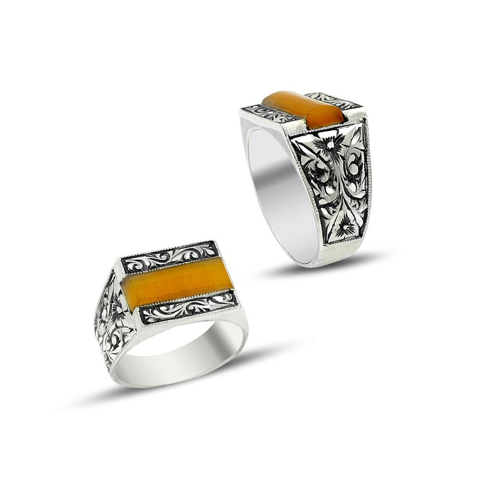 Erzurum El İşçiliği Sıkma Kehribar Gümüş Yüzük