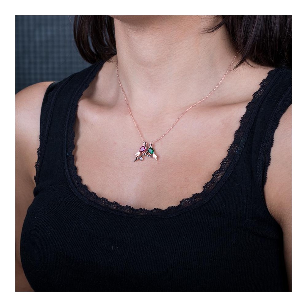 Bu hayat dolu, canlı renklerle tasarlanan kolyeyi sevgilinize ya da sevdiklerinize hediye ederek onları mutlu edebilirsiniz.925 gümüşten üretilen rose kaplama bu kolyenin işçiliğinde kuşların gövdesi renkli zirkon taşlarla süslenmiştir. İsteğe bağlı olarak kolye zincirini uzatabilirsiniz.