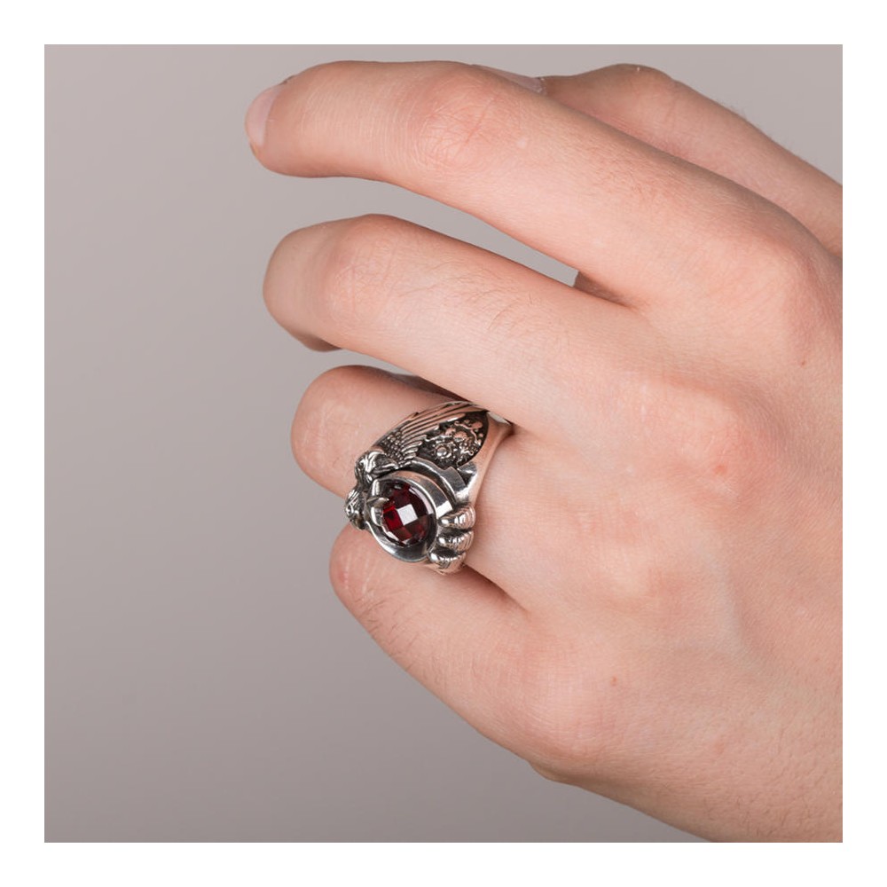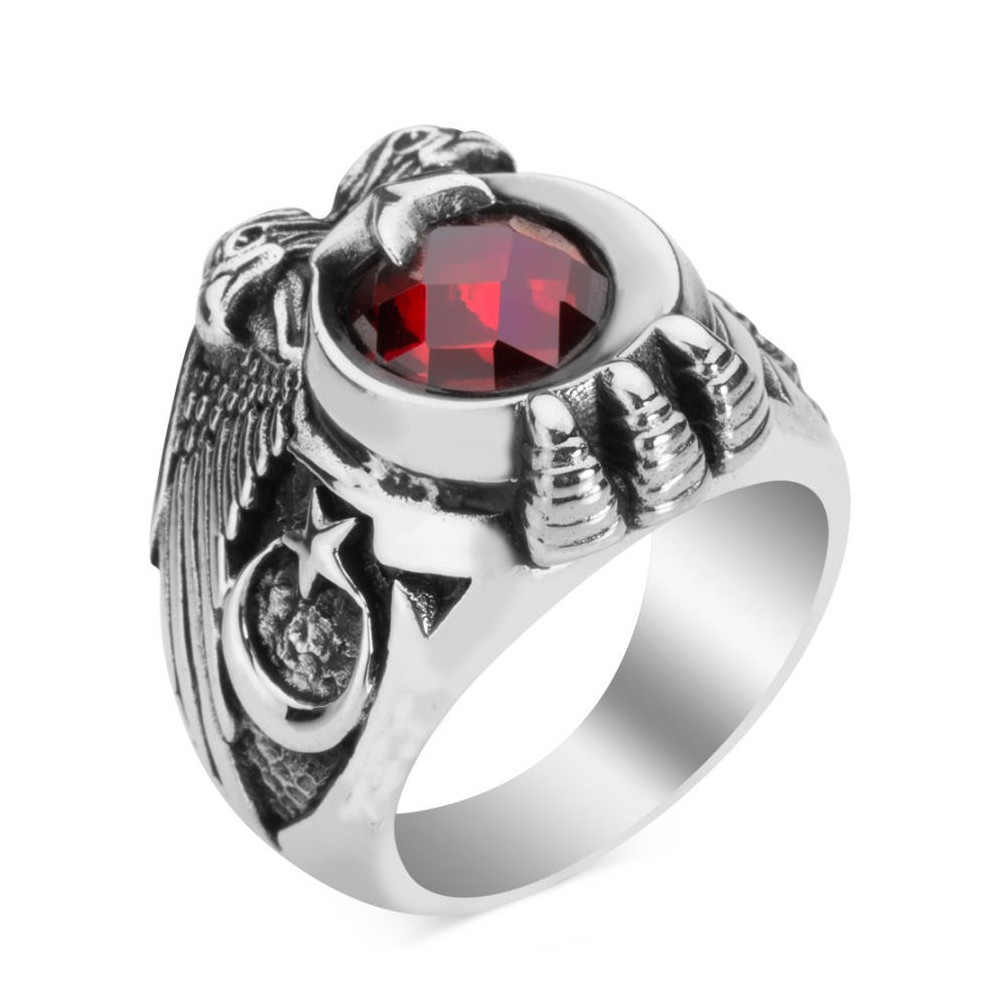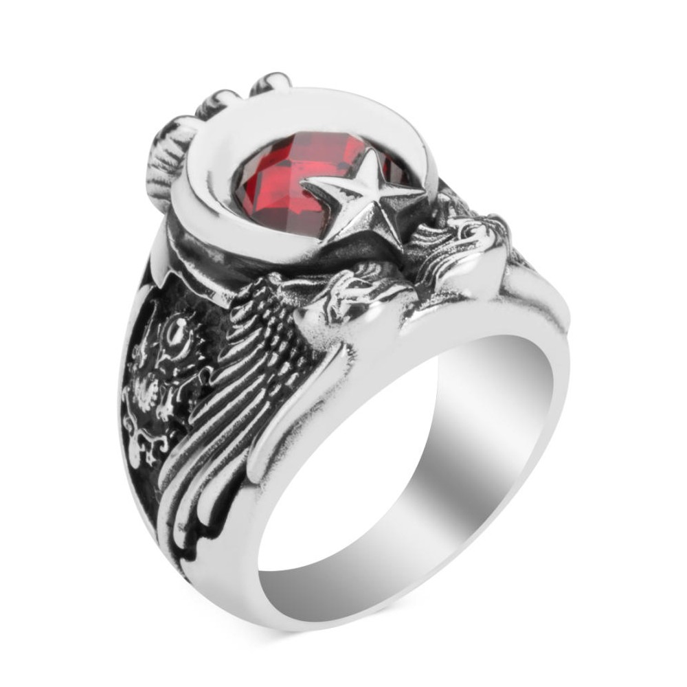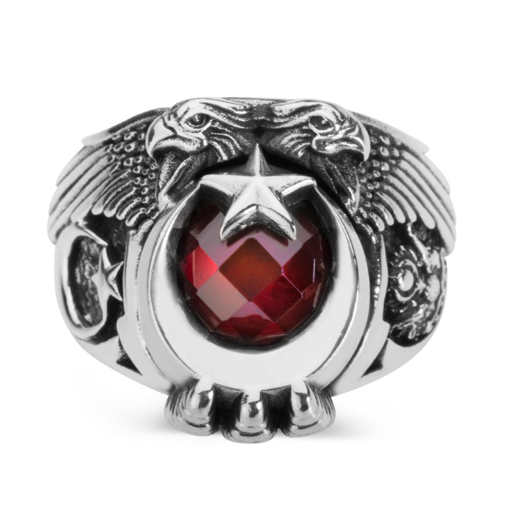 Yüzük üzerine Kartal başı figürü işlenmiştir, bu figür kırmızı zirkon taşla oluşturulan ay yıldızlı Türk Bayrağı motifi ve Kartal pençesi ile güçlendirilmiştir.