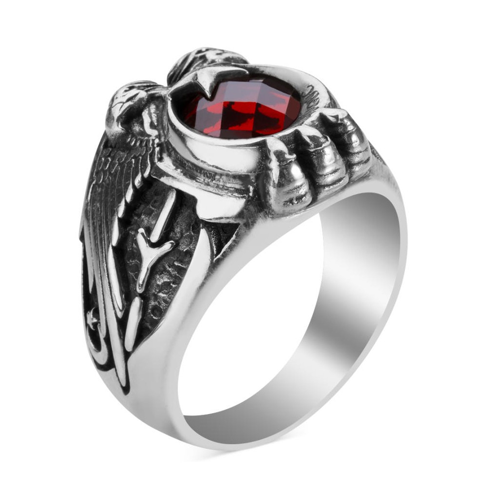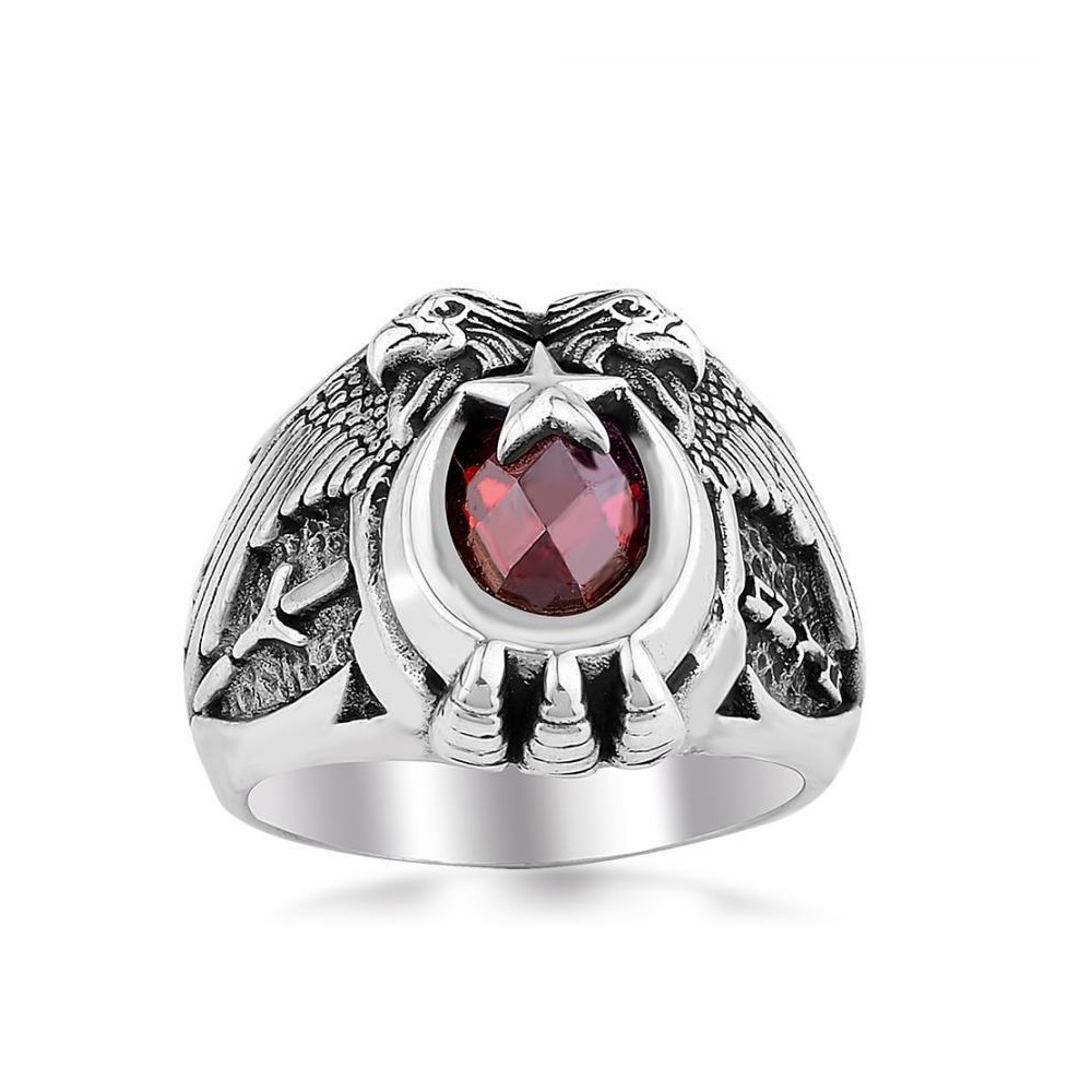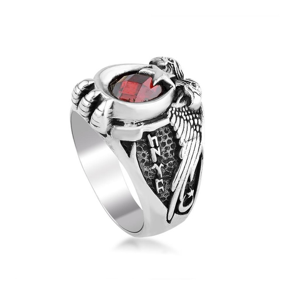 Yüzük üzerine Kartal başı figürü işlenmiştir, bu figür kırmızı zirkon taşla oluşturulan ay yıldızlı Türk Bayrağı motifi ve Kartal pençesi ile güçlendirilmiştir.