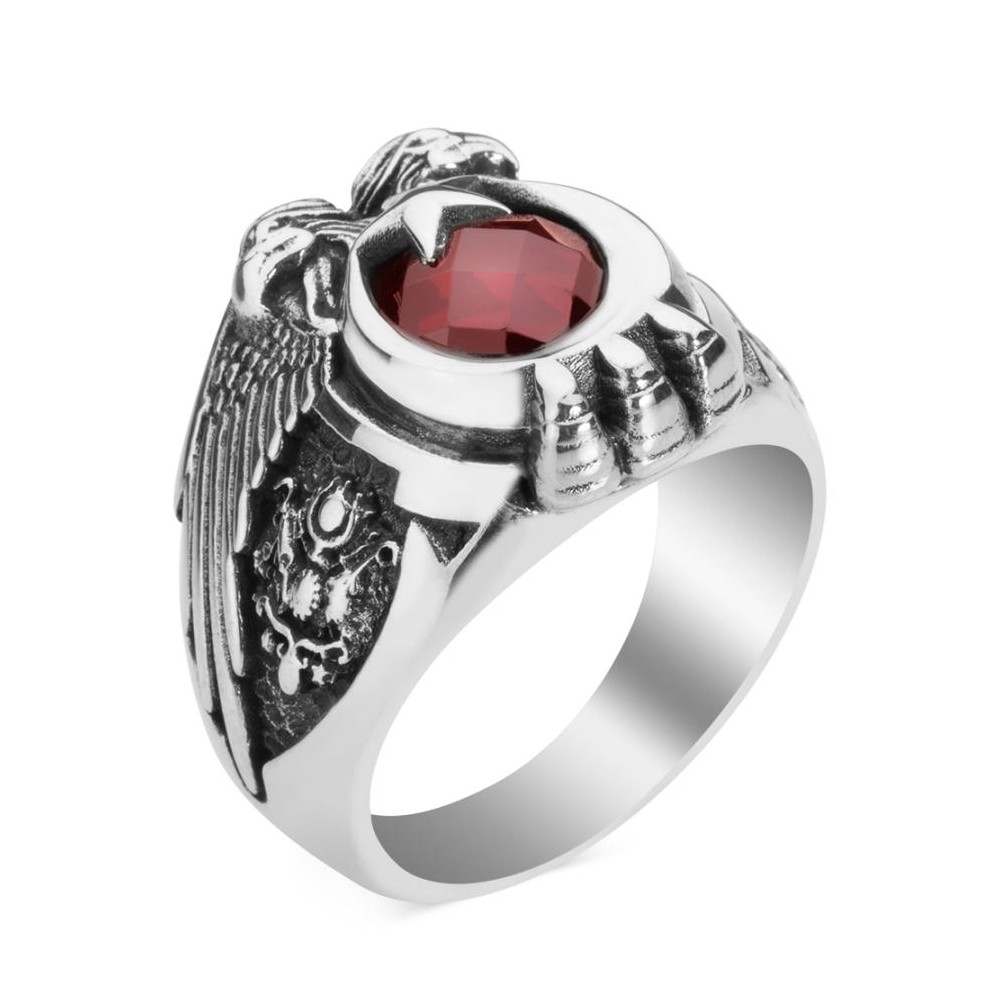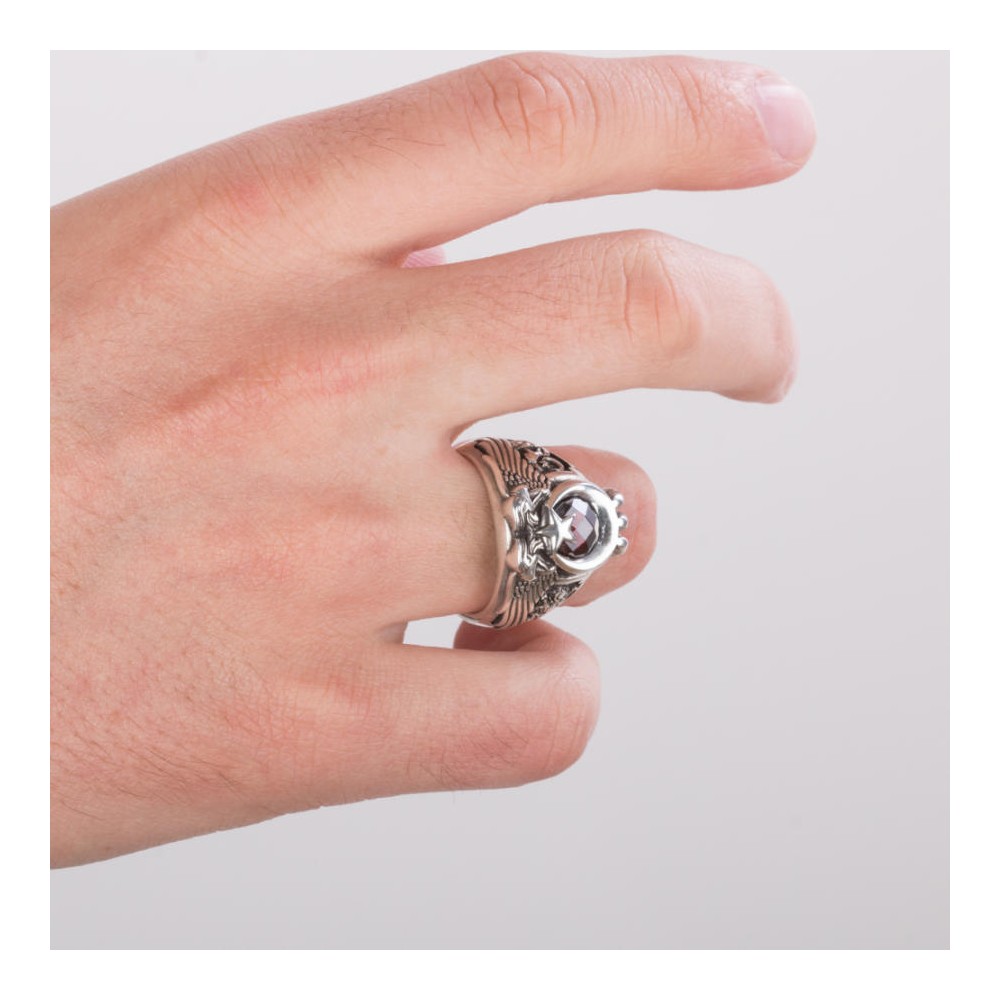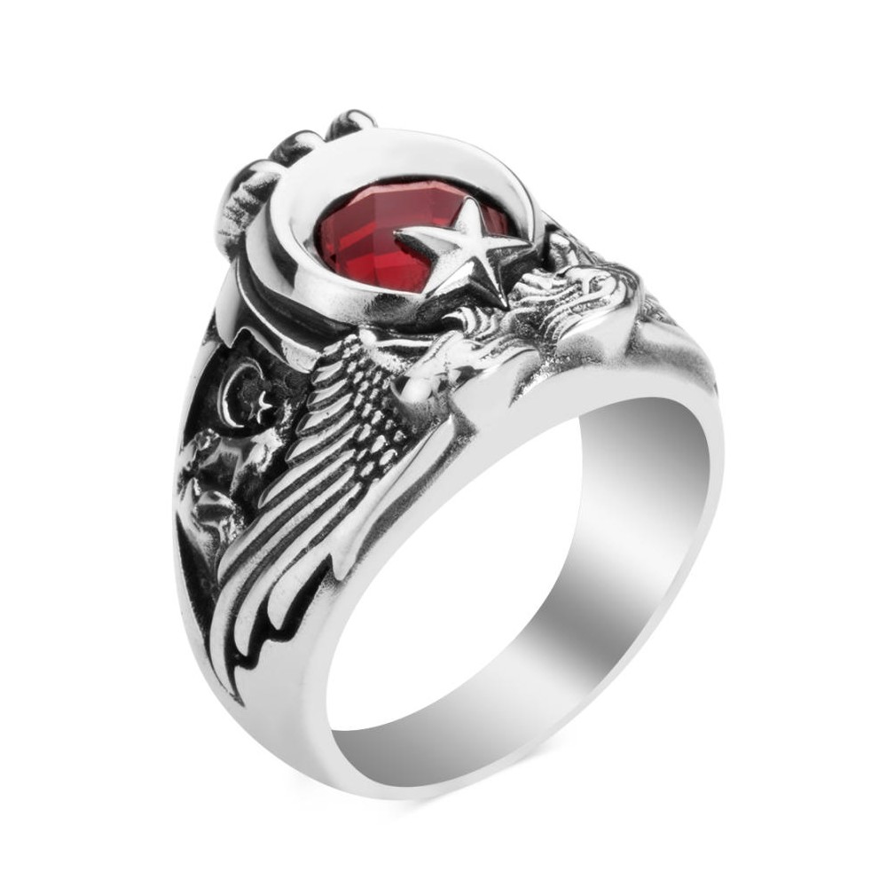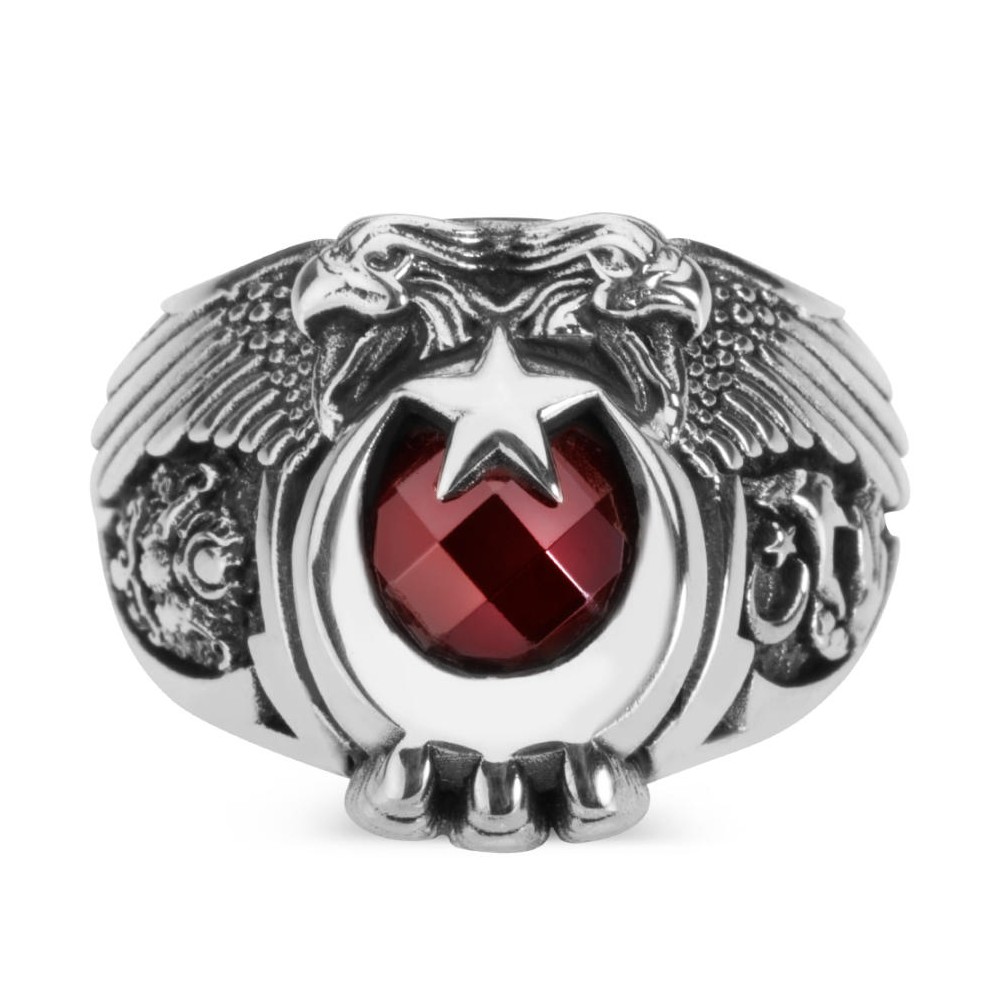 Yüzük üzerine çift Kartal başı figürü işlenmiştir, bu figür kırmızı zirkon taşla oluşturulan ay yıldızlı Türk Bayrağı motifi ve Kartal pençesi ile güçlendirilmiştir.