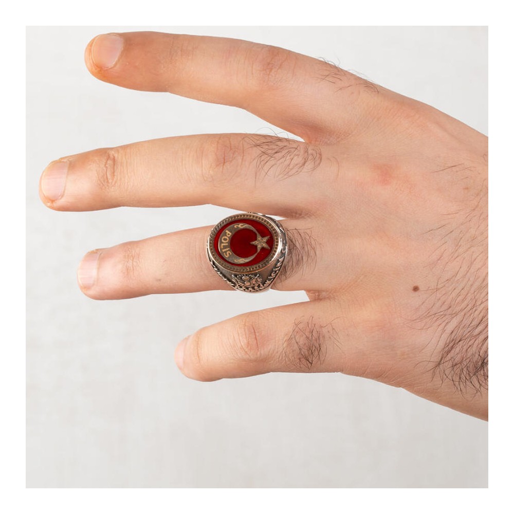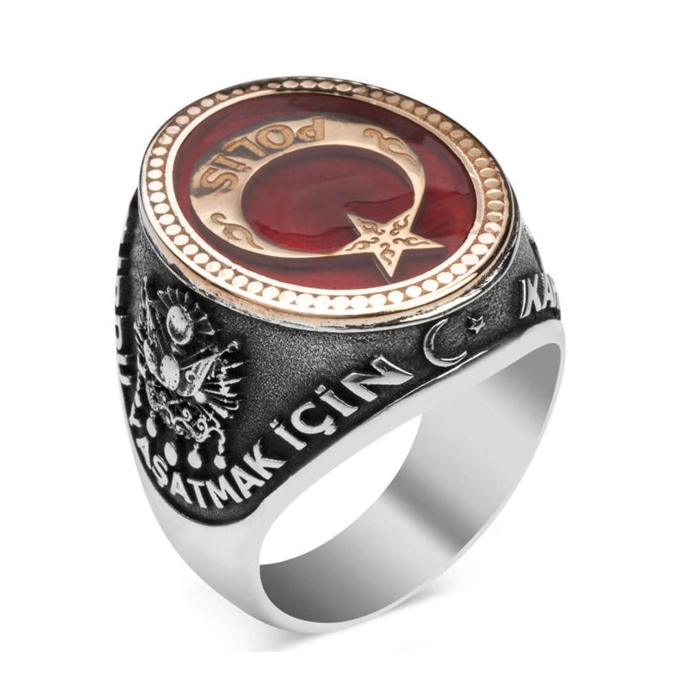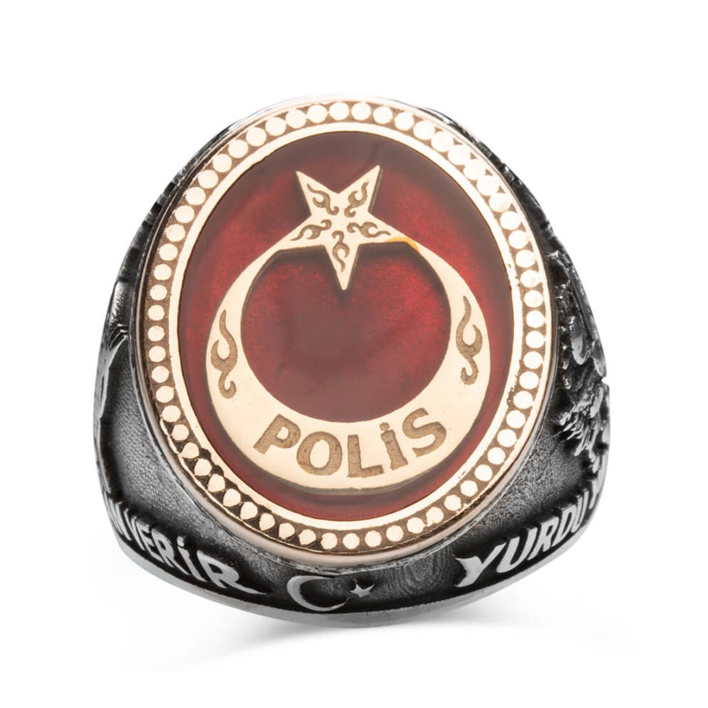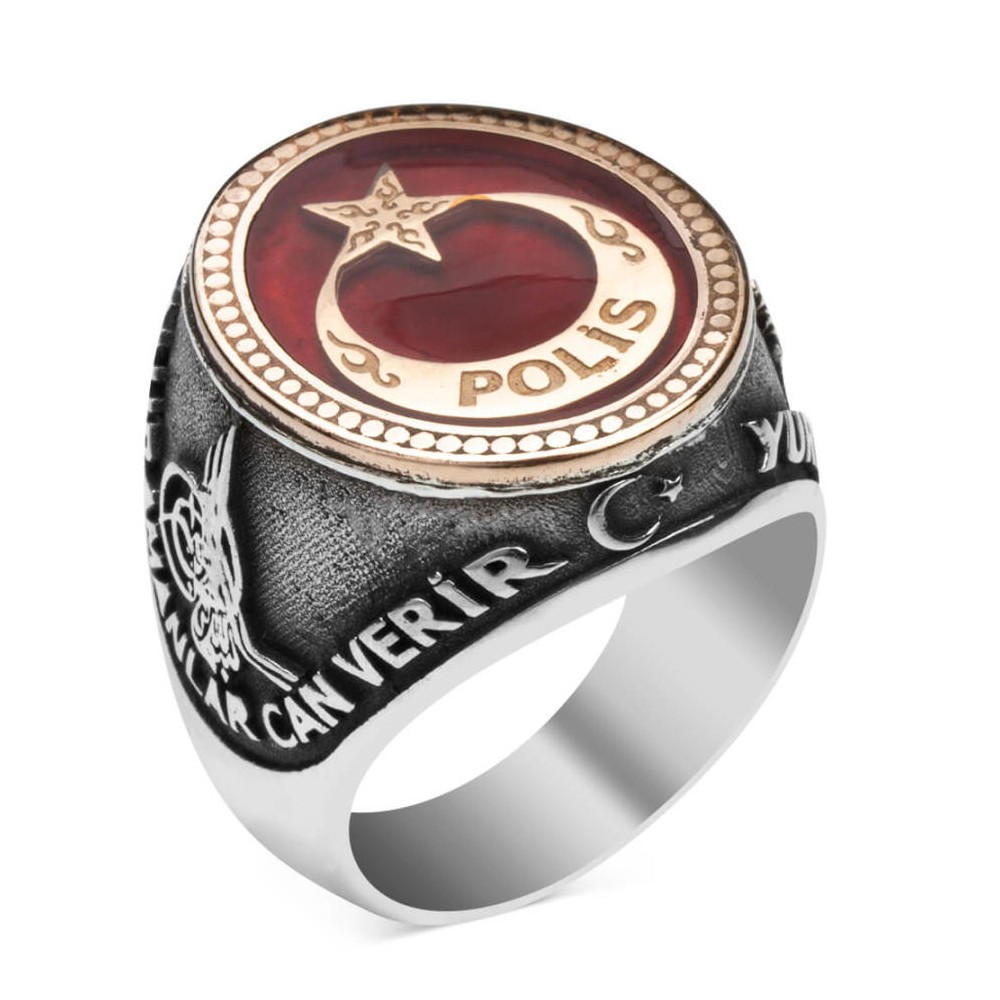 "Kahramanlar can verir, yurdu yaşatmak için.." yazısıyla çevrelenmiş bu 925 ayar gümüş Polis yüzüğü; güzel vatanımız uğruna canlarını hiçe sayarak ortaya koyan yiğitlerimize ithaf edilerek tasarlanmıştır. Türk bayrağının renginden esinlenerek tasarlanan bu aksesuar üzerinde kırmızı yüzük minesi kullanılmış, şehitlerimizin kanıyla renklenen bayrağımızın ay ve yıldız motifiyle süslenmiş, üzerine Polis yazılmıştır. Yüzüğün bir yanına "Kahramanlar can verir" yazısı ve Tuğra bulunurken, diğer yanında "Yurdu yaşatmak için" yazısı ve Osmanlı arması bulunmaktadır. Yüzük yaklaşık 16 gr'dır.