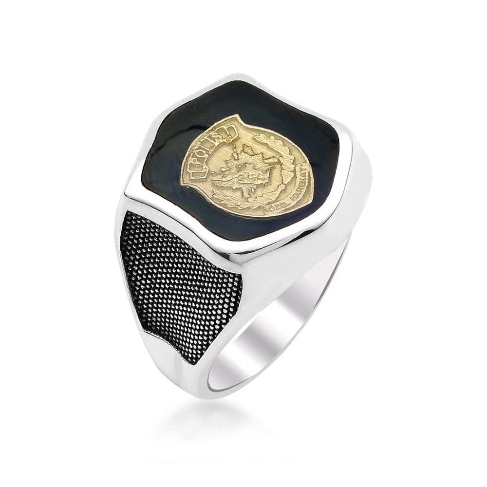 Siyah minesi üzerine Polis Özel Harekat Amblemli 925 ayar gümüş erkek yüzük.Ürün Özellikleri925 ayar gümüşle üretilmiştir.Yaklaşık olarak 14 gram ağırlığındadır.Yüzük üzerinde siyah mine bulunmaktadır. Siyah yüzük minesi üzerine Polis Özel Harekat Amblemi işlenmiştir.