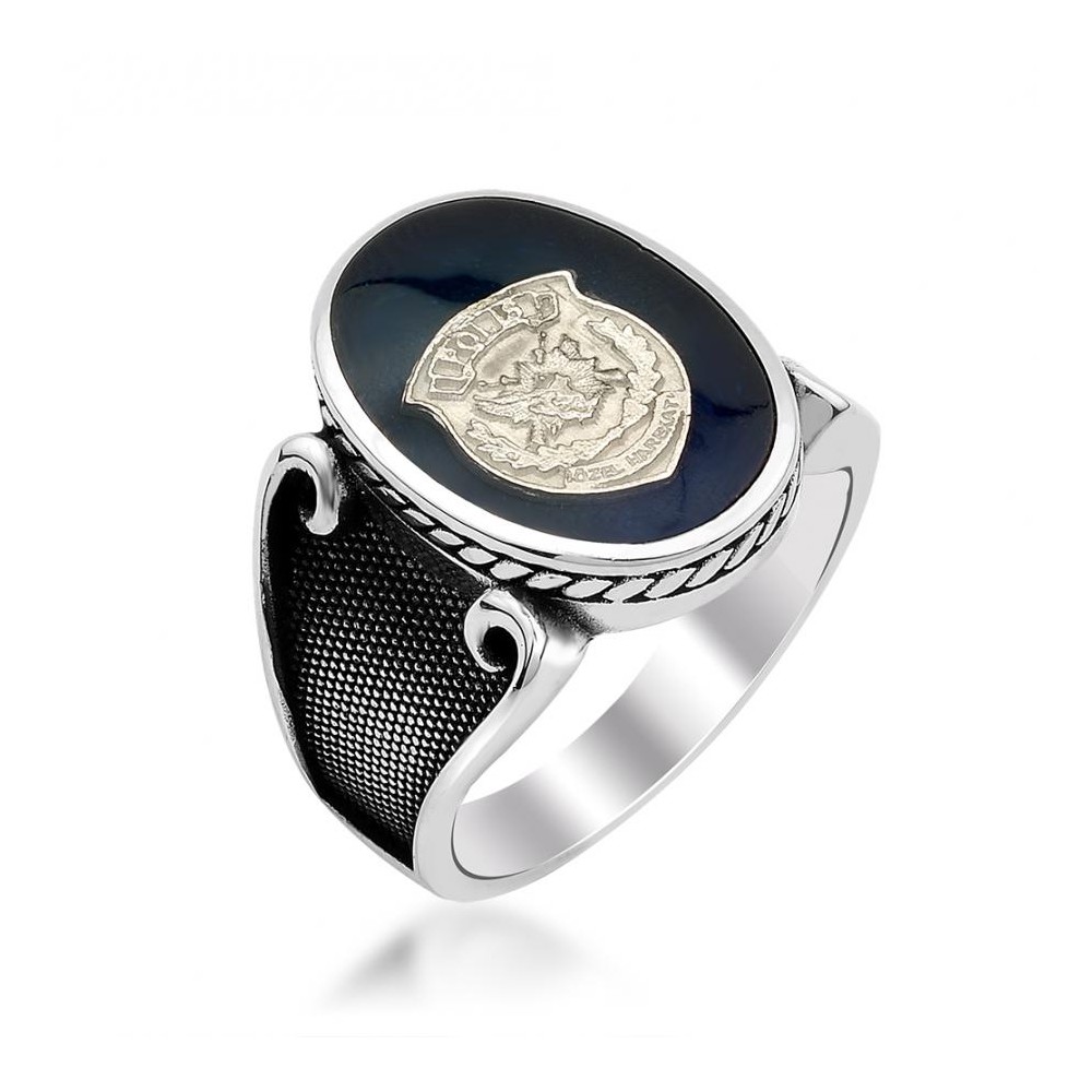 Siyah mineli Polis Özel Harekat Amblemli 925 ayar gümüş erkek yüzük.Ürün Özellikleri925 ayar gümüşle üretilmiştir.Yaklaşık olarak 14 gram ağırlığındadır.Yüzük üzerinde siyah mine bulunmaktadır. Siyah yüzük minesi üzerine Polis Özel Harekat Amblemi işlenmiştir.