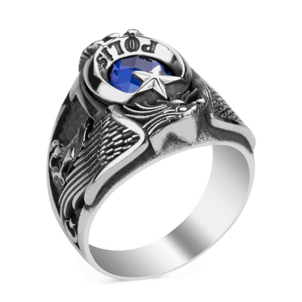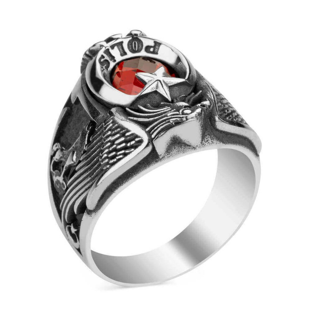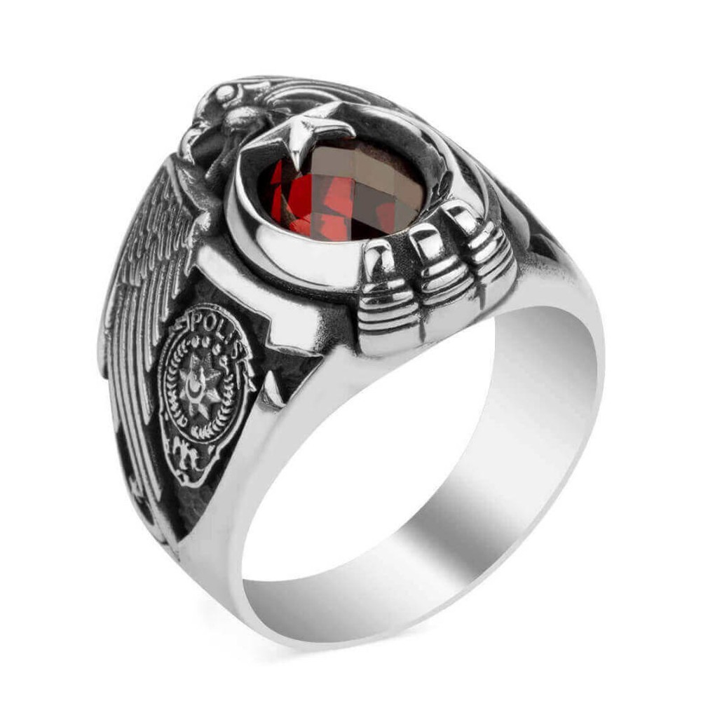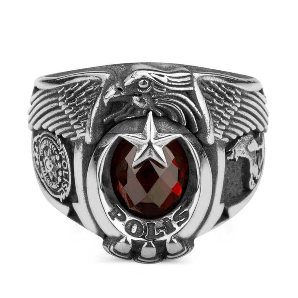 Mesleğinizin gururunu parmağınızda taşıyın!Polislik mesleği mensuplarına özel hazırlanan bu Anı yüzüğü ile siz de gücü parmağınızda hissedeceksiniz! 925 ayar gümüş üretimli bu aksesuarda hakimiyet sembolü olan tek başlı kartal tasarımı kullanılmıştır. Yüzük yanlarında "Polis Arması" diğer yanında ise Türklüğün sembolü "Bozkurt" figürüne yer verilmiştir. Siz de hemen Kuyumcumdan'a gelerek sipariş verin, mesleğinize özel olarak tasarlanan şık bir aksesuarın sahibi olun.