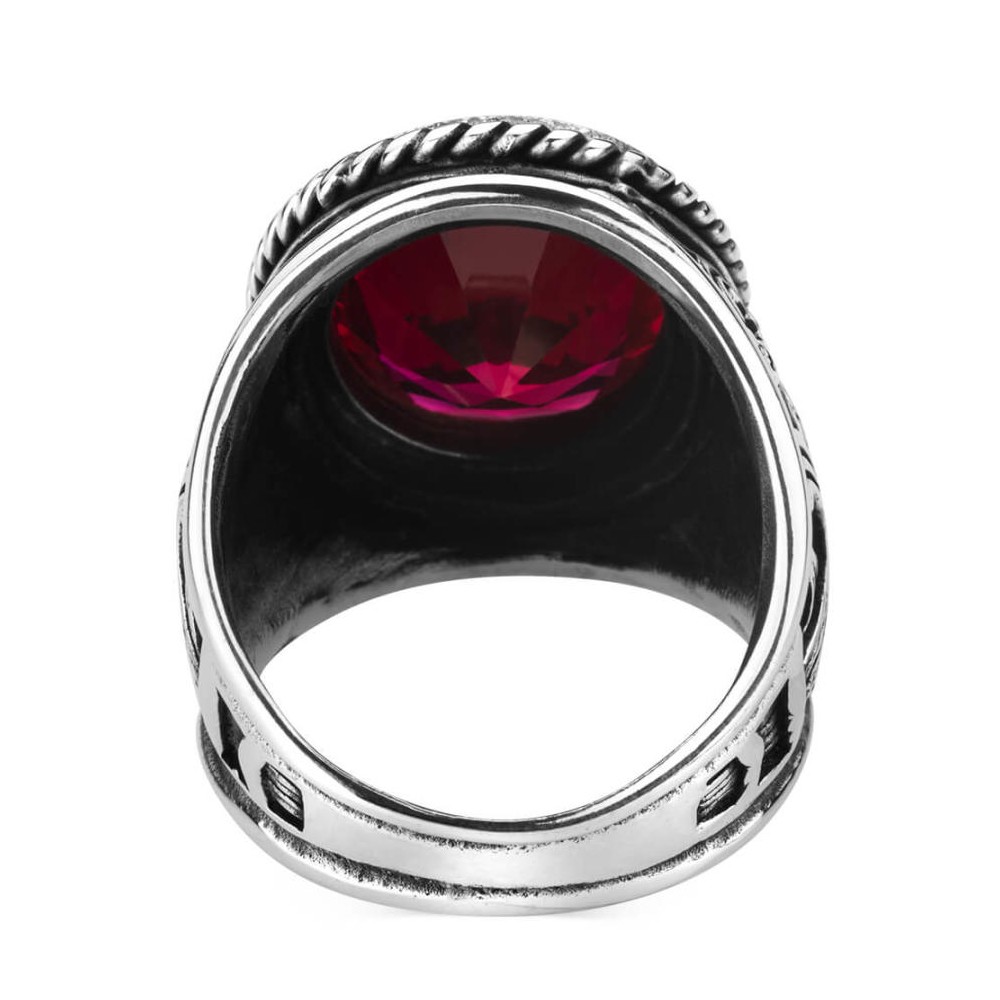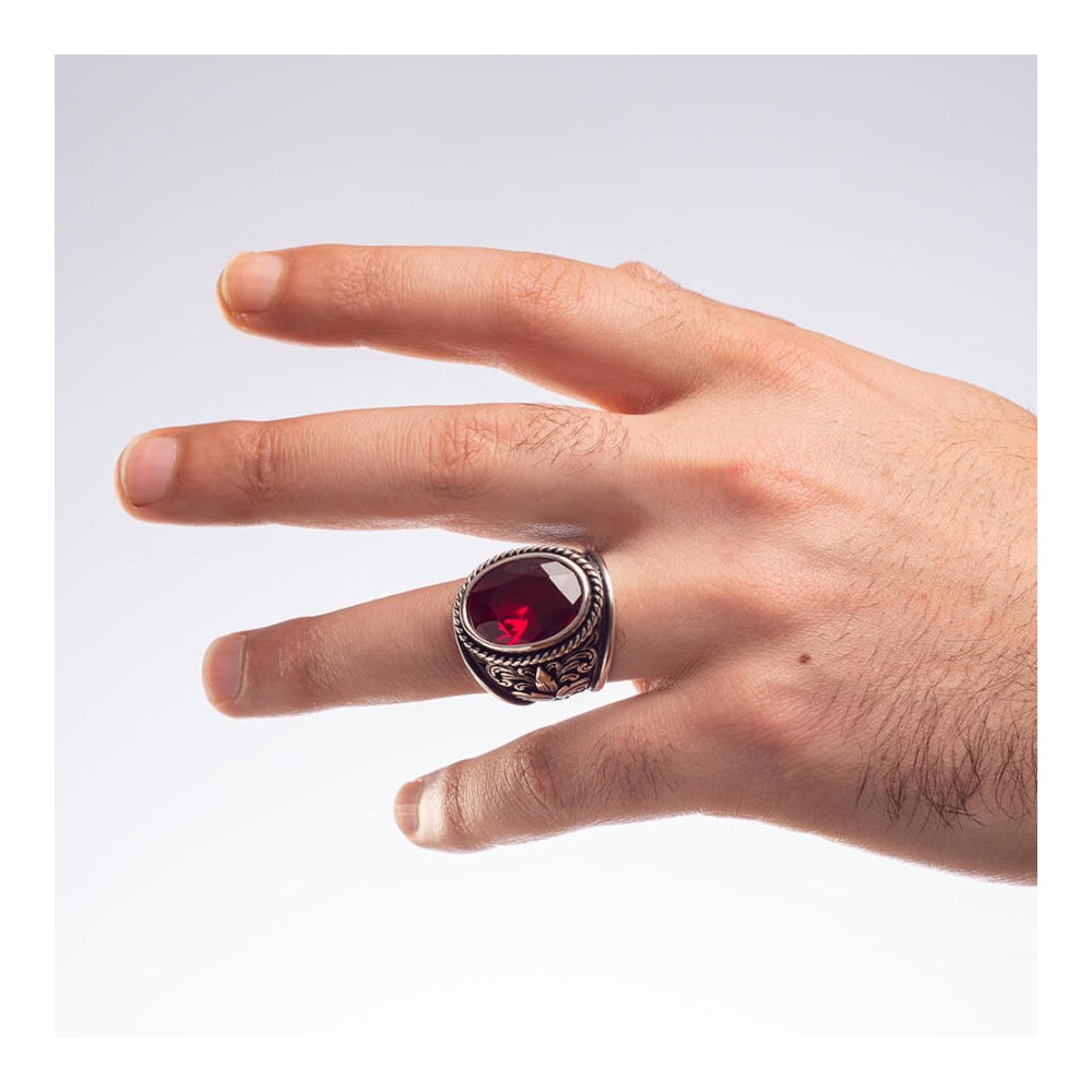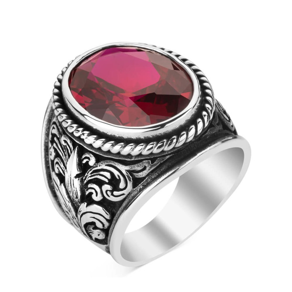 925 Ayar Gümüş Ruby Taşlı Motifli Erkek Yüzük