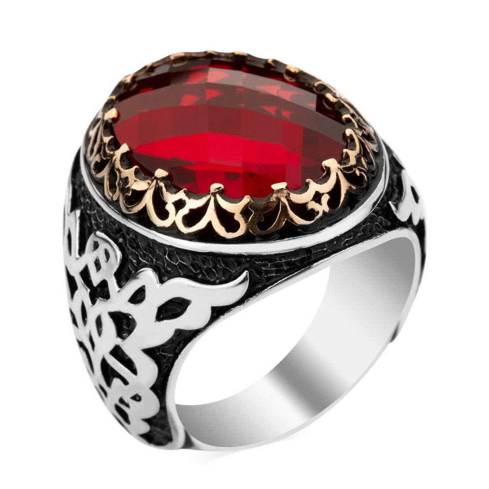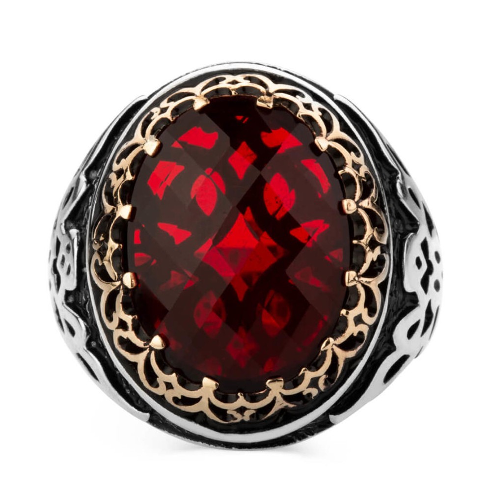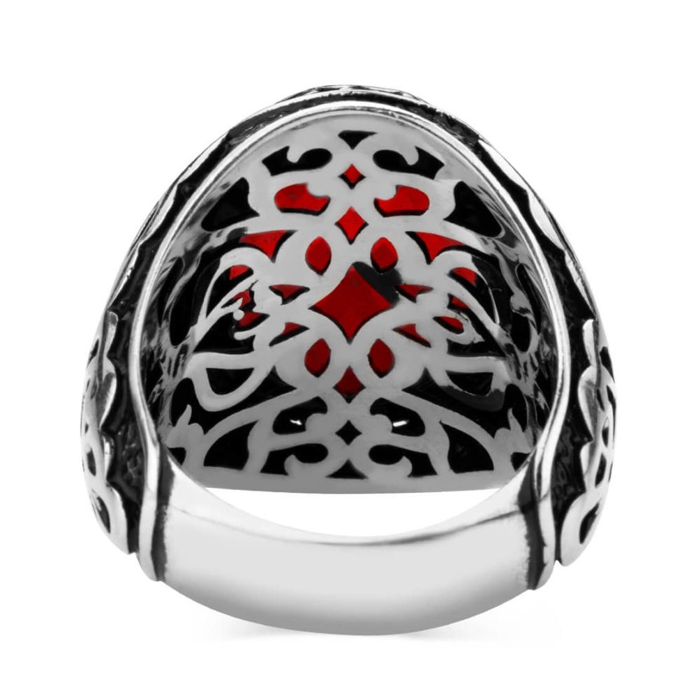 925 Ayar Gümüş Simetrik Desenli Kırmızı Taşlı Erkek Yüzüğü