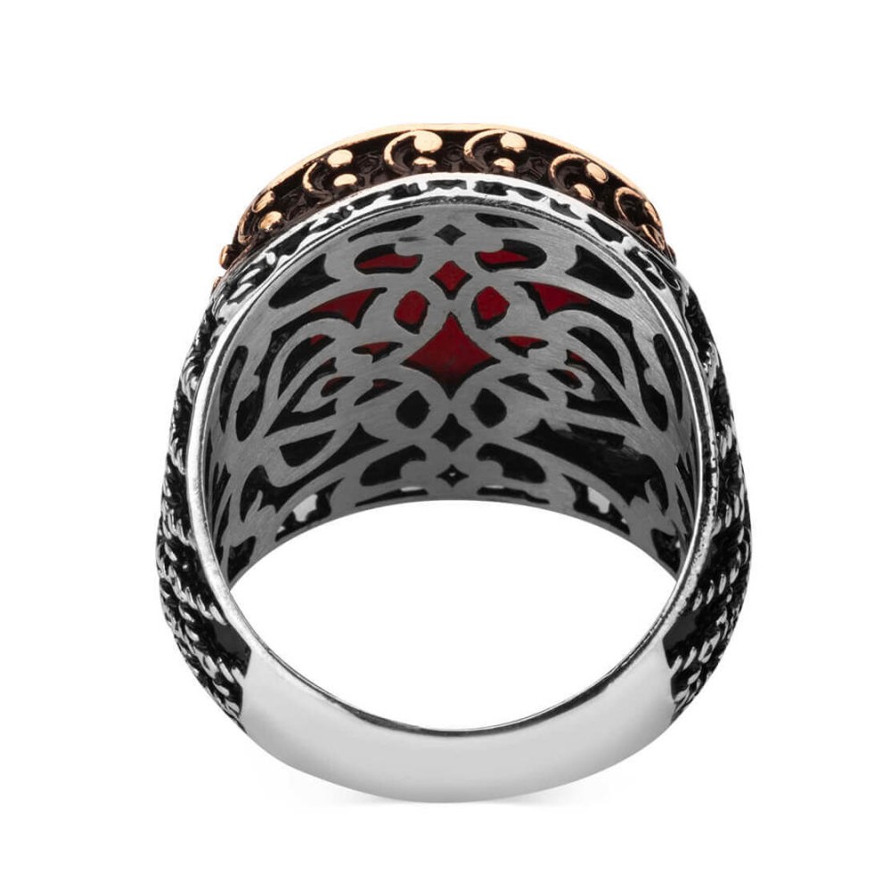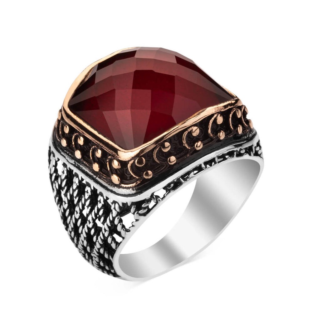 925 Ayar Gümüş Zirkon Kırmızı Taşlı İşlemeli Erkek Yüzük