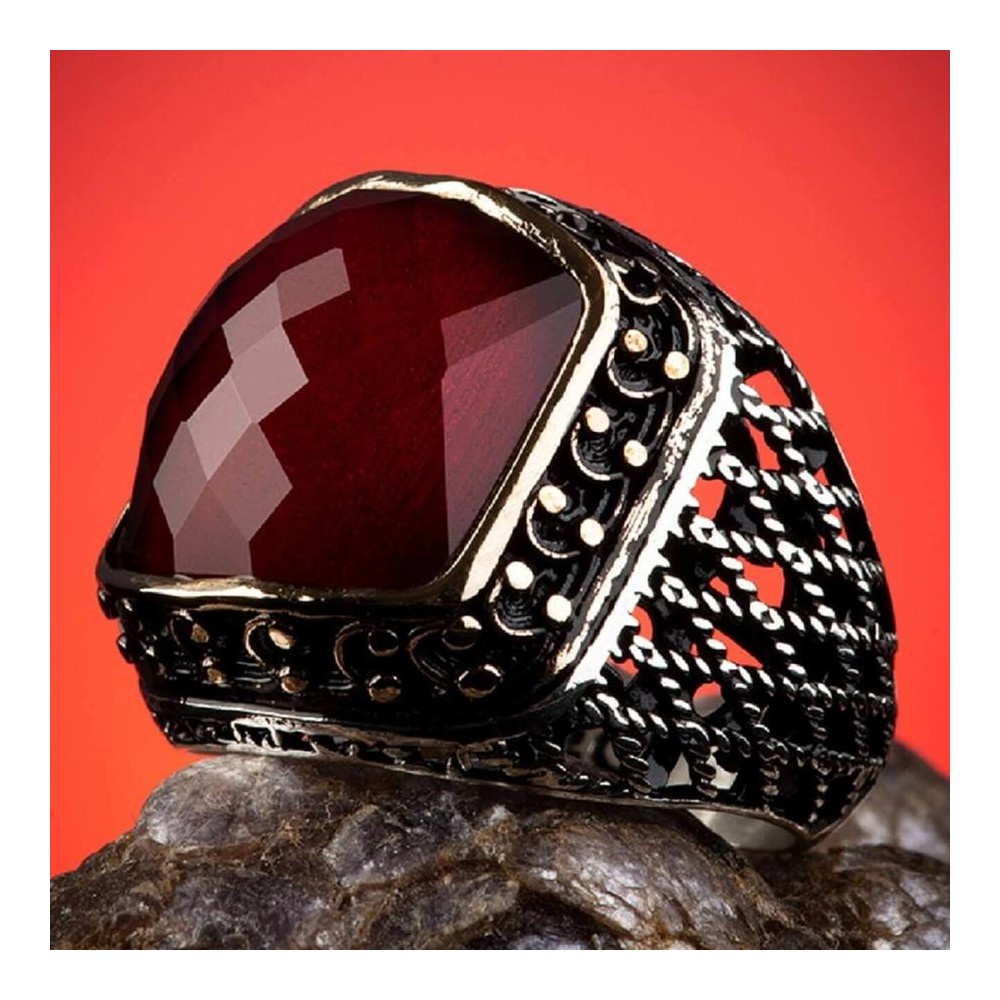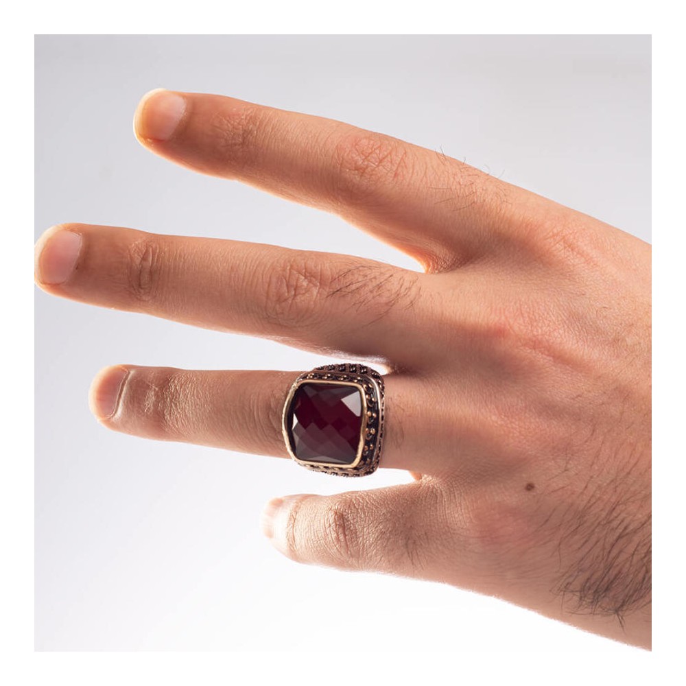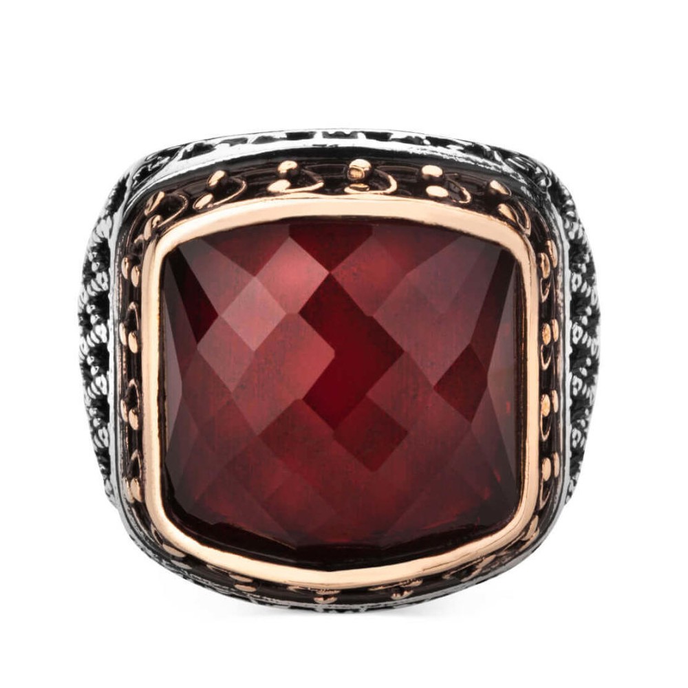 925 Ayar Gümüş Zirkon Kırmızı Taşlı İşlemeli Erkek Yüzük Ürün Özellikleri
