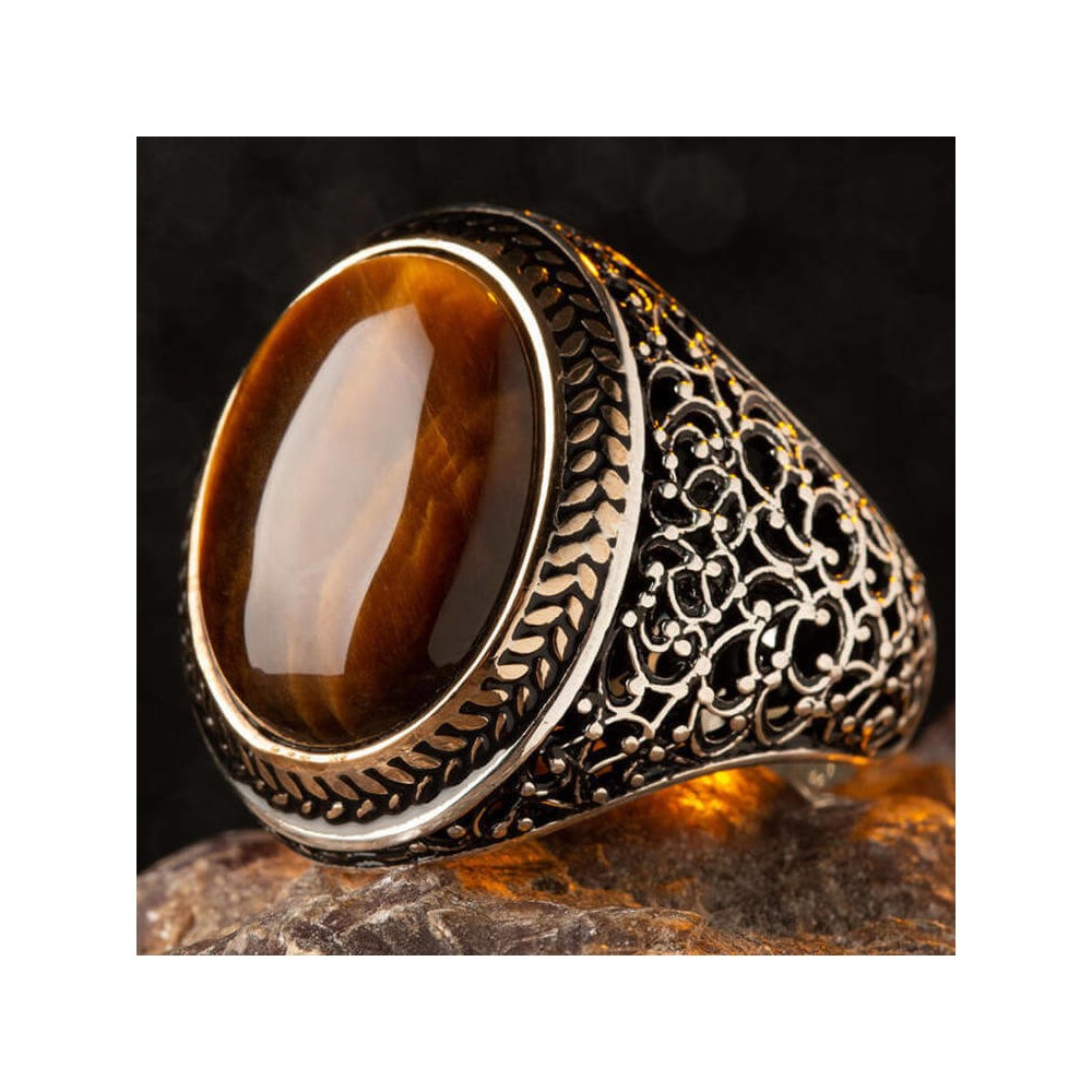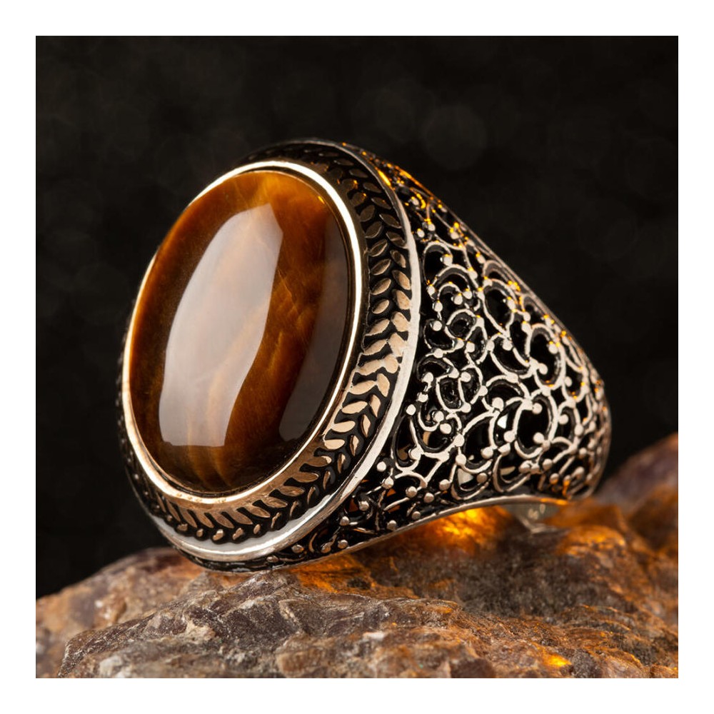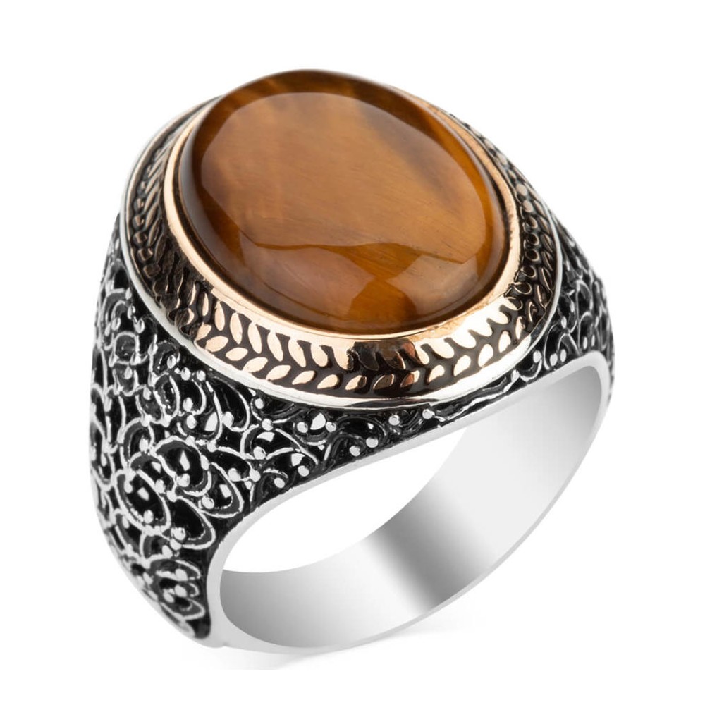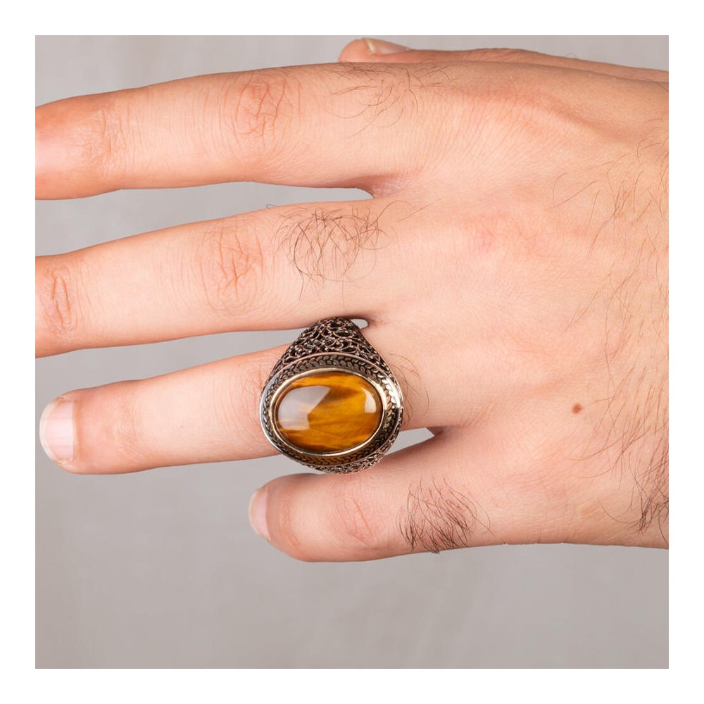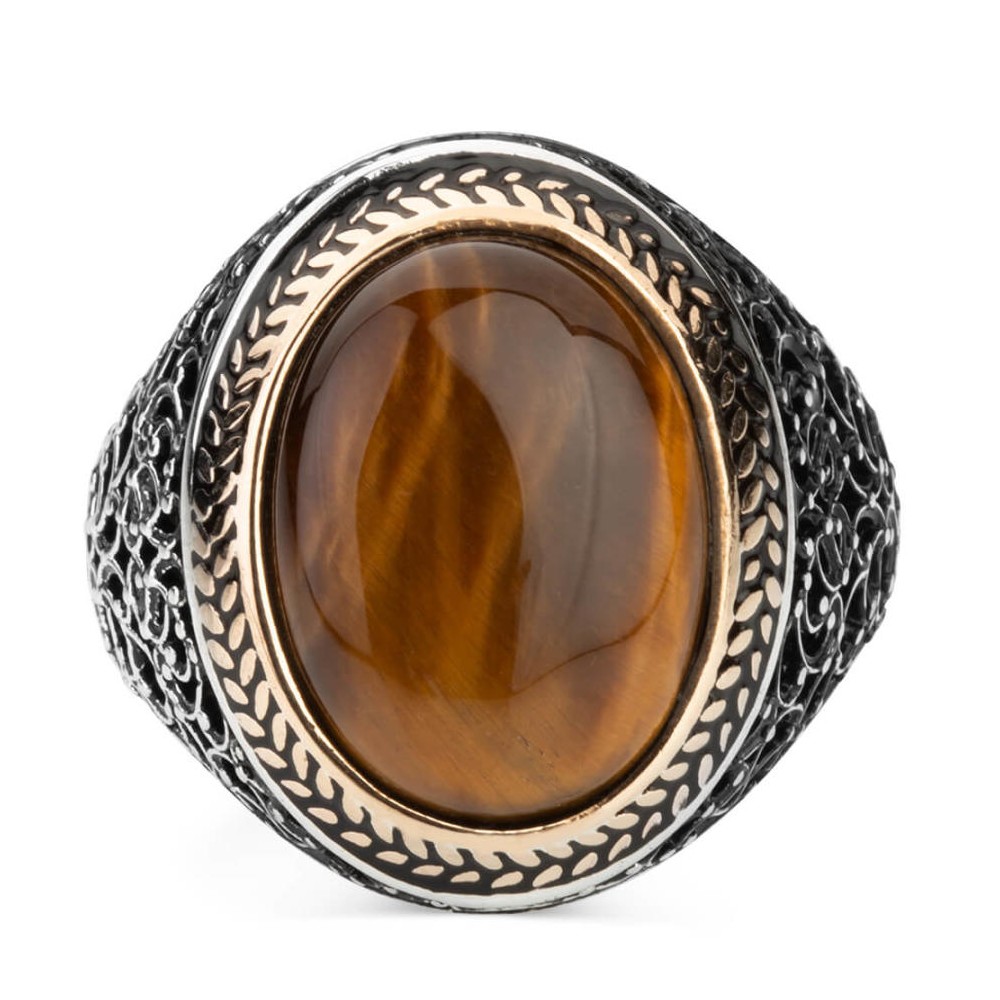 Oval Kahverengi Kaplangözü Taşlı Simetrik Desen Gümüş Erkek Yüzük