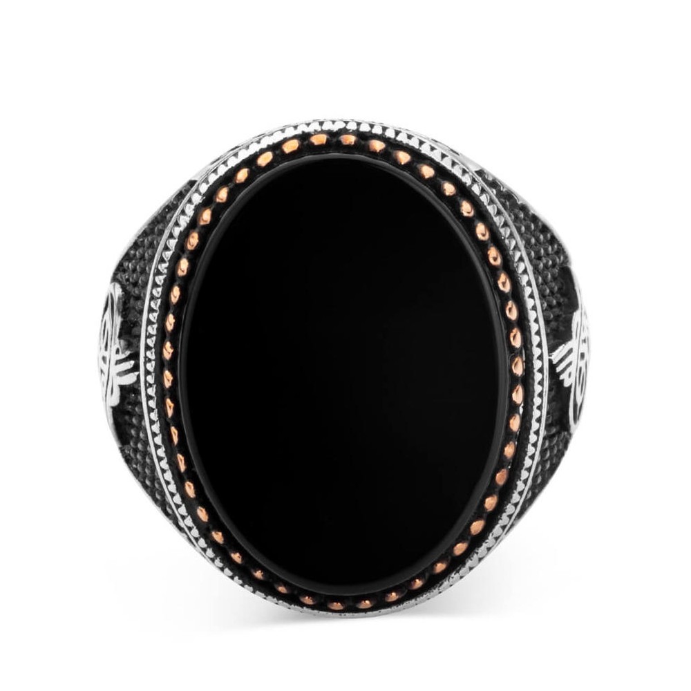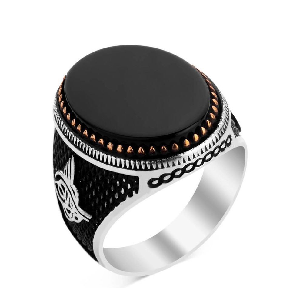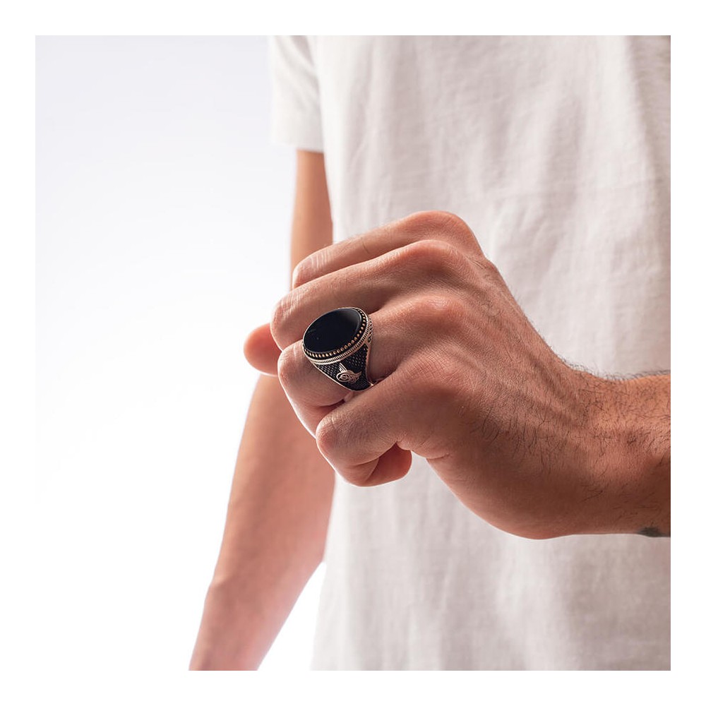 Oval Siyah Oniks Taş Tuğralı Gümüş Erkek Yüzük
