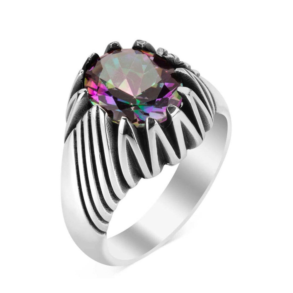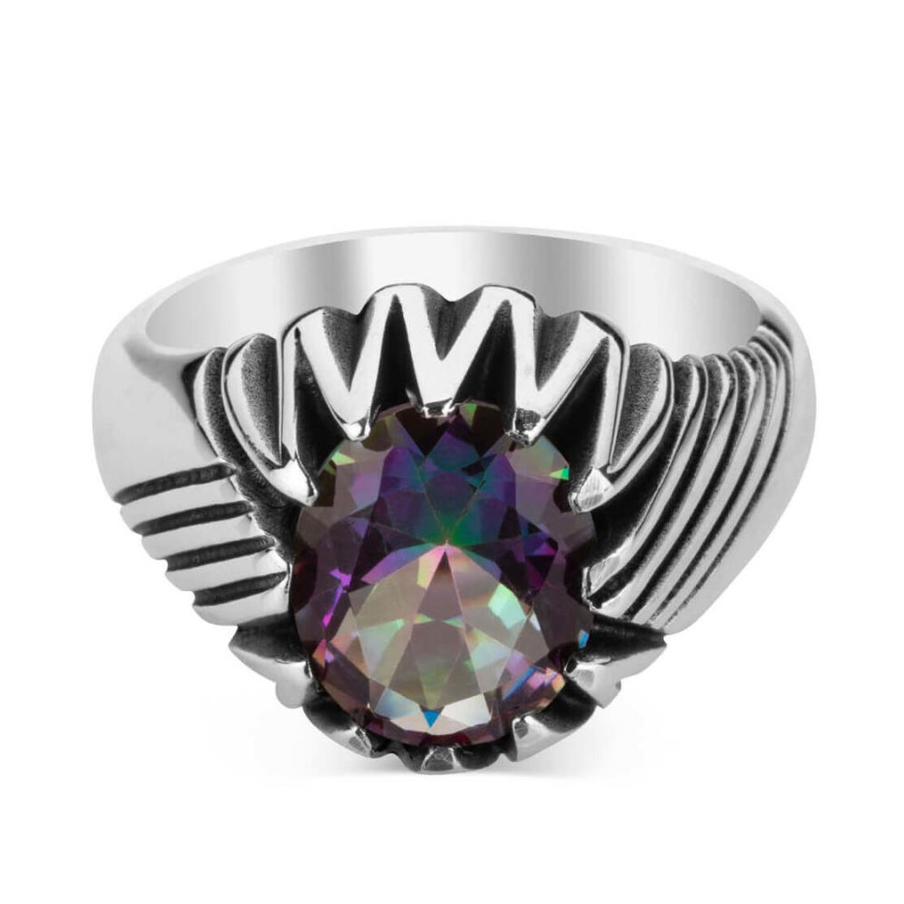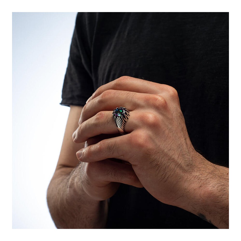 Renk Değiştiren Mistik Topaz Taşlı Motifli Gümüş Erkek Yüzük