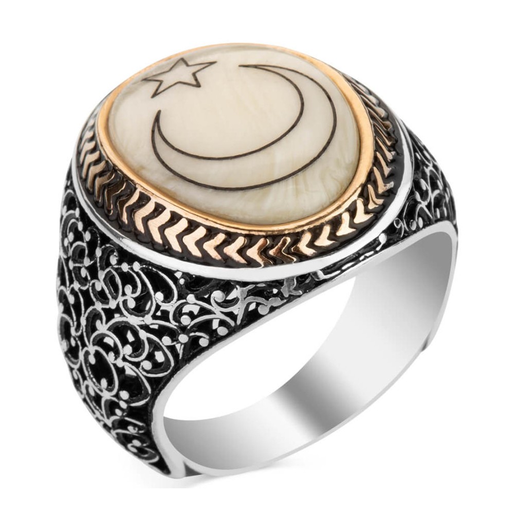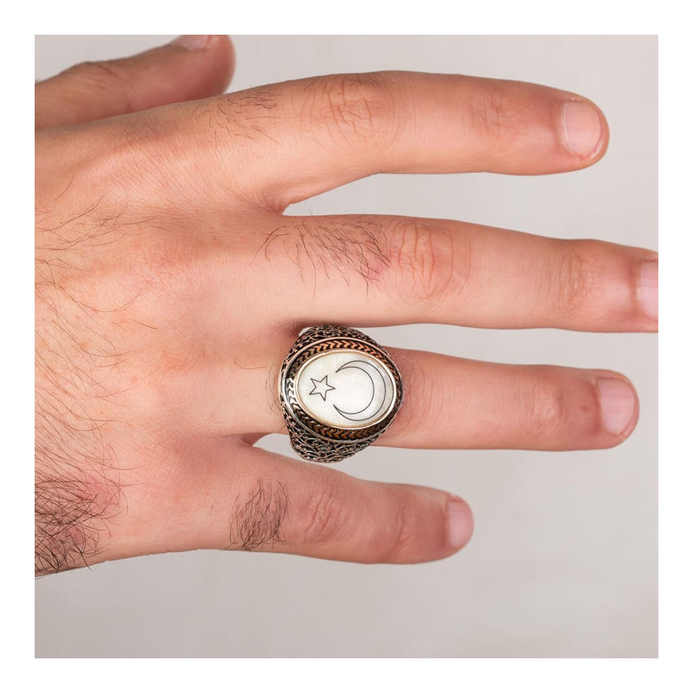 Sedef Üzerine Ay-Yıldızlı 925 Ayar Gümüş Yüzük
