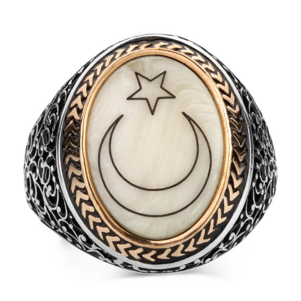 Sedef üzerine "Ay-Yıldız" işlemesiyle süslenmiş 925 ayar gümüş yüzük özellikleri