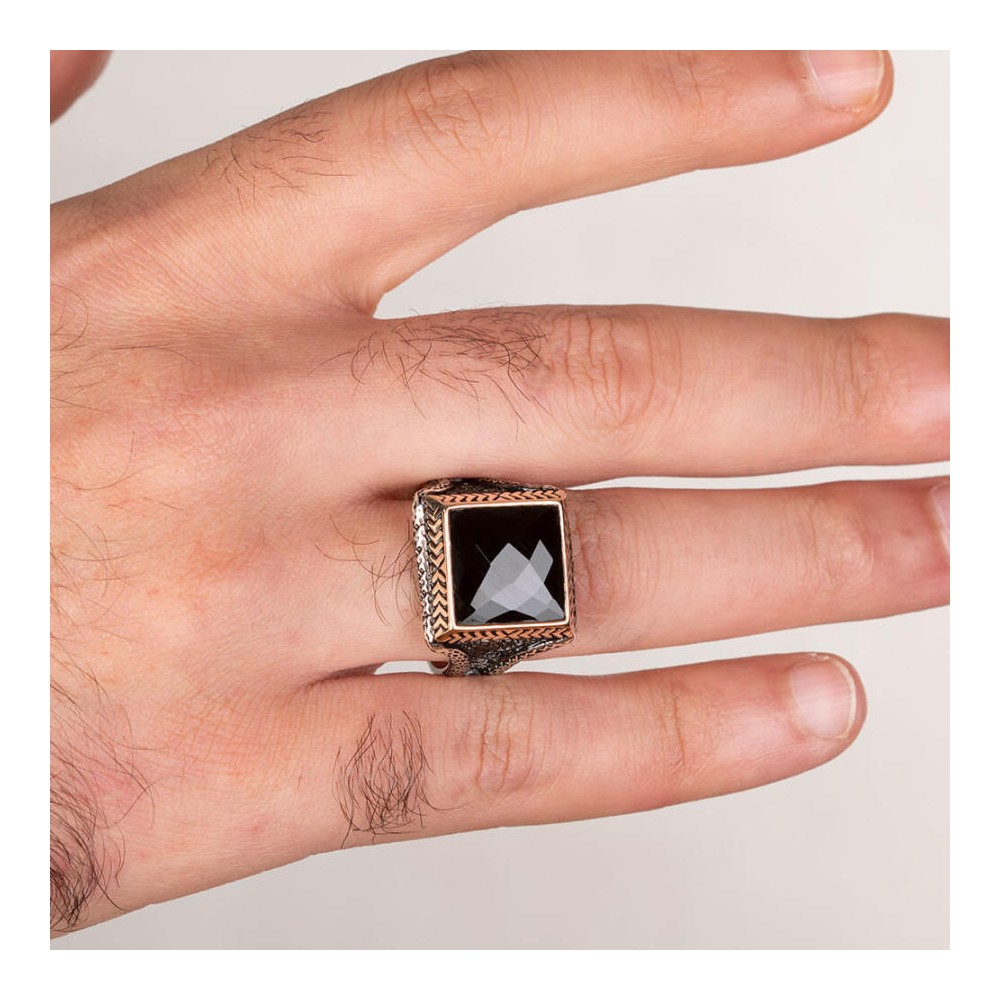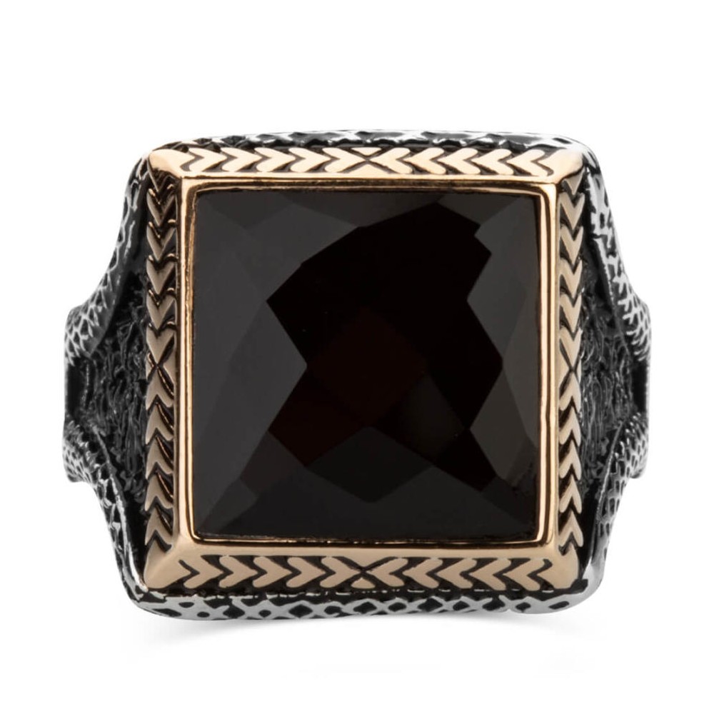 Siyah Zirkon Taşlı Kare Tasarım Erkek Gümüş Yüzüğü