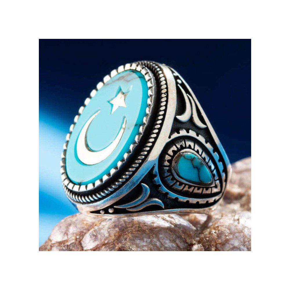 Yüzük üzerinde turkuaz firuze taş üzerine ay yıldız motifi mevcuttur.Taş üzerindeki desenler farklılık gösterebilir.