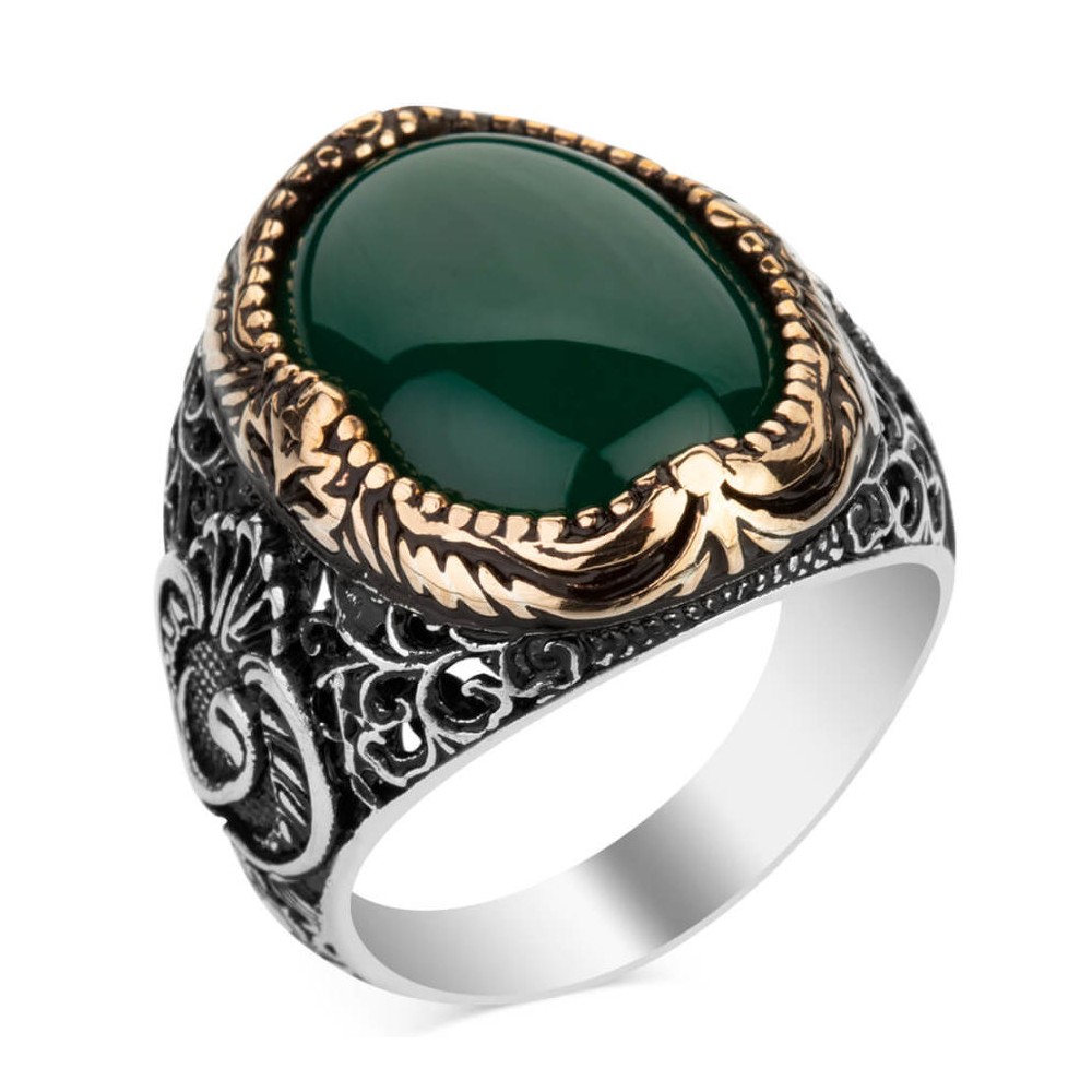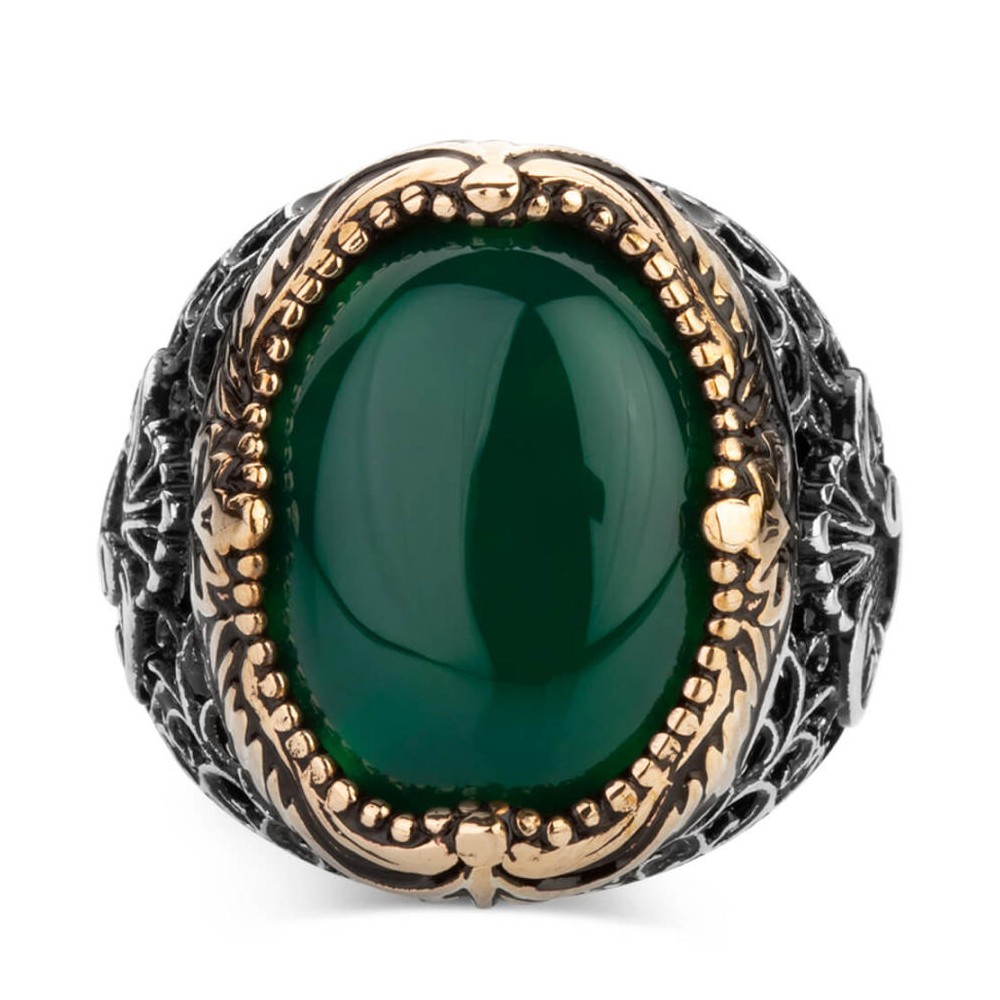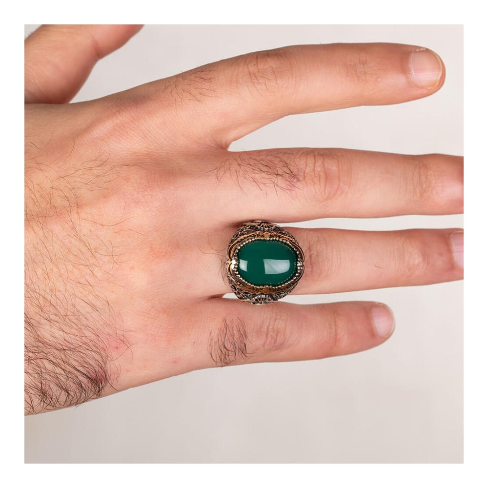 Yeşil Akik Taşlı Vav Figürlü Gümüş Erkek Yüzük